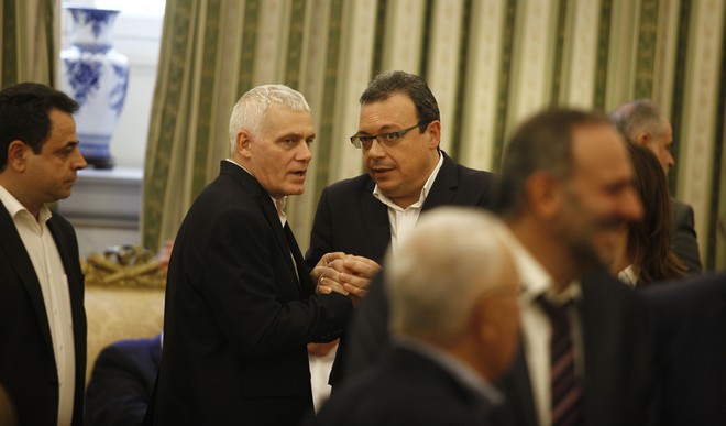 Προσερχόμενος στο Προεδρικό Μέγαρο και ερωτηθείς για τη συμπόρευσή του με τον κ. Πιτσιόρλα, ο υπουργός Περιβάλλοντος και Ενέργειας, Γιώργος Σταθάκης είπε: «Οι προκλήσεις είναι μπροστά μας, αλλά το πνεύμα της κυβέρνησης είναι «προχωράμε μπροστά».