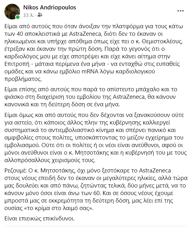Πυρά για τους χειρισμούς της κυβέρνησης στο ζήτημα του εμβολίου AstraZeneca, εξαπολύει ο διευθυντής του Γραφείου Τύπου του Αρχηγού της Αξιωματικής Αντιπολίτευσης, Νίκος Ανδριόπουλος με ανάρτησή του στο Facebook.