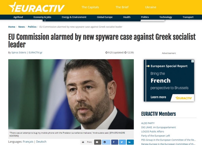 Ανησυχία στην Ευρωπαϊκή Επιτροπή έχει προκαλέσει η νέα υπόθεση απόπειρας υποκλοπής του κινητού τηλεφώνου του σοσιαλιστή ηγέτη Νίκου Ανδρουλάκη όπως γράφει χαρακτηριστικά σε άρθρο του το Euractiv. Φιλοξενεί σχόλιο εκπροσώπου της Ευρωπαϊκής Επιτροπής –που δεν κατονομάζεται- πως «οποιαδήποτε προσπάθεια των υπηρεσιών εθνικής ασφάλειας να αποκτήσουν παράνομη πρόσβαση σε δεδομένα πολιτών, συμπεριλαμβανομένων δημοσιογράφων και πολιτικών αντιπάλων, εφόσον επιβεβαιωθεί, είναι απαράδεκτη», προσθέτοντας ότι «η Επιτροπή αναμένει από τις εθνικές αρχές να εξετάσουν διεξοδικά τυχόν τέτοιους ισχυρισμούς και να αποκαταστήσουν την εμπιστοσύνη των πολιτών».