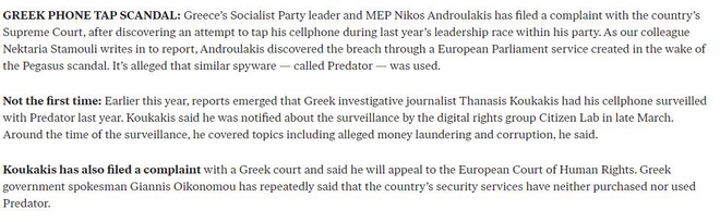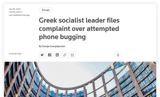 «Σκάνδαλο παρακολούθησης τηλεφώνου» τιτλοφορεί άρθρο του το Politico, σχετικά με τα όσα καταγγέλλει ο Νίκος Ανδρουλάκης, αναφερόμενο και στην παρακολούθηση του κινητού του δημοσιογράφου Θανάση Κουκάκη.