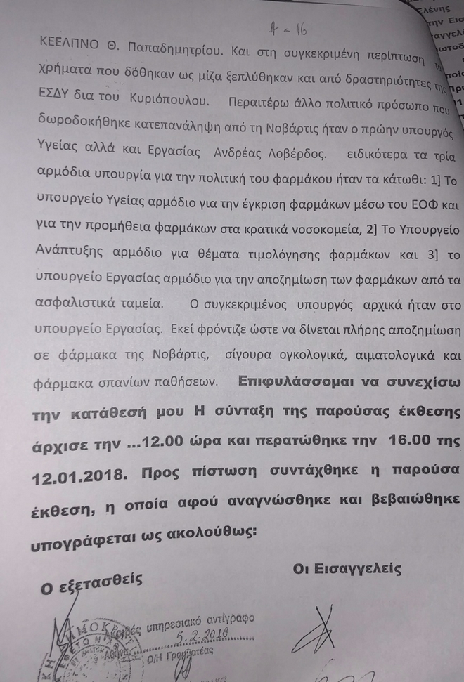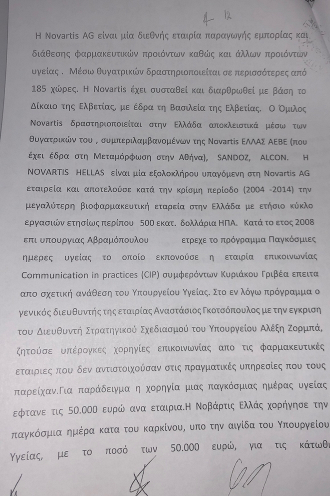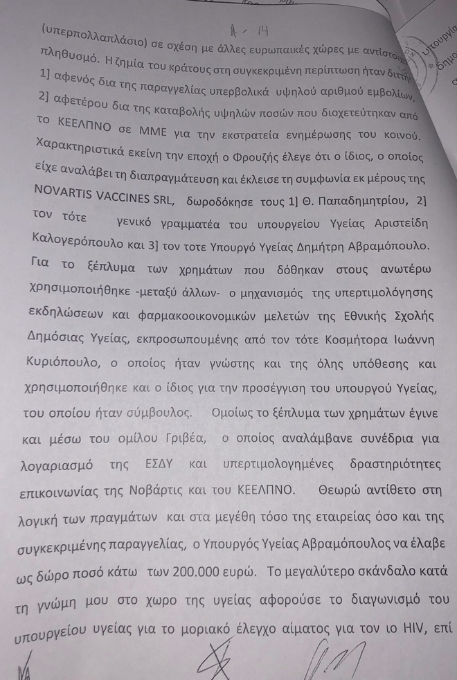 “Για το ξέπλυμα των χρημάτων που δόθηκαν στους ανωτέρω χρησιμοποιήθηκε – μεταξύ άλλων – ο μηχανισμός της υπερτιμολόγησης εκδηλώσεων και φαρμακοοικονομικών μελετών της Εθνικής Σχολής Δημόσιας Υγείας, εκπροσωπούμενης από τον τότε κοσμήτορα Ιωάννη Κυριόπουλο, ο οποίος ήταν γνώστης και της όλης υπόθεσης και χρησιμοποιήθηκε και ο ίδιος για την προσέγγιση του υπουργού Υγείας του οποίου ήταν σύμβουλος. Ομοίως το ξέπλυμα των χρημάτων έγινε και μέσω του ομίλου Γριβέα ο οποίος αναλάμβανε συνέδρια για λογαριασμό της ΕΣΔΥ και υπερτιμολογημένες δραστηριότητες επικοινωνίας της Νοβάρτις και του ΚΕΕΛΠΝΟ. Θεωρώ αντίθετο στην λογική των πραγμάτων και στα μεγέθη της εταιρείας όσο και της συγκεκριμένης παραγγελίας, ο υπουργός Υγείας Δημήτρης Αβραμόπουλος να έλαβε δώρο ποσό κάτω των 200.000 ευρώ”, σύμφωνα με την κατάθεση του προστατευόμενου μάρτυρα.