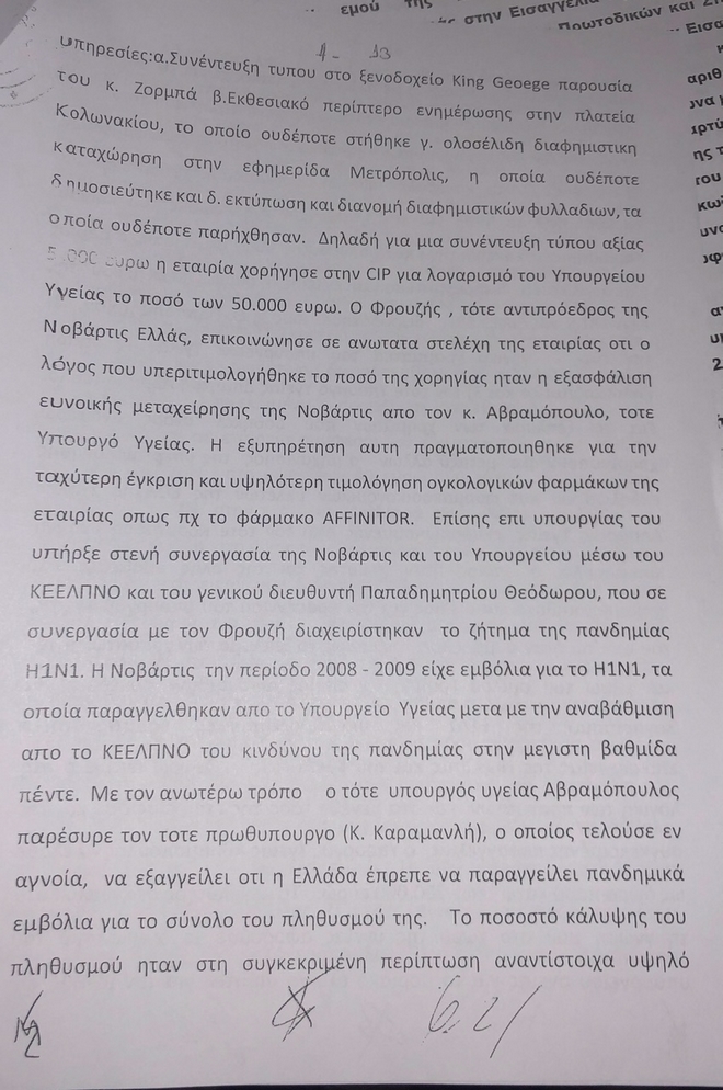 “Η Νοβάρτις Ελλάς χορήγησε την παγκόσμια ημέρα κατά του καρκίνου υπό την αιγίδα του υπουργείου Υγείας με το ποσό των 50.000 ευρώ για τις κάτωθι υπηρεσίες: α) Συνέντευξη τύπου στο ξενοδοχείο King George παρουσία του κ. Ζορμπά β) Εκθεσιακό περίπτερο ενημέρωσης στην πλατεία Κολωνακίου το οποίο ουδέποτε στήθηκε γ) ολοσέλιδη διαφημιστική καταχώρηση στην εφημερίδα Μετρόπολις η οποία ουδέποτε δημοσιεύτηκε και δ) εκτύπωση και διανομή διαφημιστικών φυλλαδίων τα οποία ουδέποτε παρήχθησαν Δηλαδή για μια συνέντευξη τύπου αξίας 5.000 ευρώ η εταιρεία χορήγησε στην CIP για λογαριασμό του υπουργείου Υγείας 50.000 ευρώ. Ο Φρουζής τότε αντιπρόεδρος της Νοβάρτις Ελλάς επικοινώνησε σε ανώτατα στελέχη της εταιρείας ότι ο λόγος που υπερτιμολογήθηκε το ποσό της χορηγίας ήταν η εξόφληση ευνοϊκής μεταχείρισης της Νοβάρτις από τον κ. Αβραμόπουλο, τότε υπουργό Υγείας”, συνεχίζει ο προστατευόμενος μάρτυρας στην κατάθεσή του.