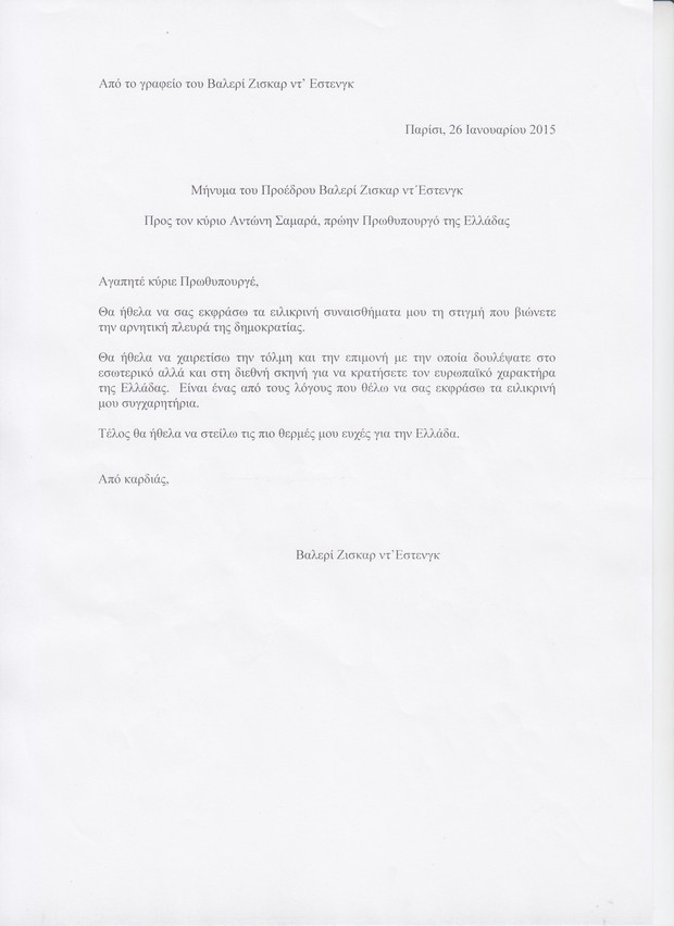 Μήνυμα του Προέδρου Βαλερί Ζισκάρ Ντ'Εστέν προς τον τέως πρωθυπουργό, Αντώνη Σαμαρά. Τι του απάντησε ο Αντώνης Σαμαράς