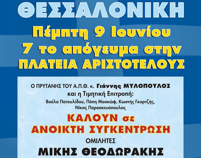 Την Πέμπτη στις 7 το απόγευμα στην πλατεία Αριστοτέλους, ο πρύτανης του Αριστοτελείου Πανεπιστημίου Θεσσαλονίκης, Ιωάννης Μυλόπουλος και η Τιμητική Επιτροπή από εξέχοντες Θεσσαλονικείς, καλούν τον Μίκη Θεοδωράκη σε ανοιχτή συγκέντρωση-συλλαλητήριο, με σύνθημα ΟΧΙ στο ΜΝΗΜΟΝΙΟ, ΟΧΙ στο ξεπούλημα, ΟΧΙ στην ξένη εξάρτηση.