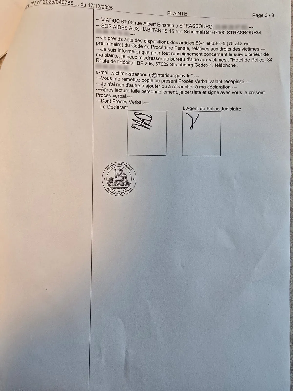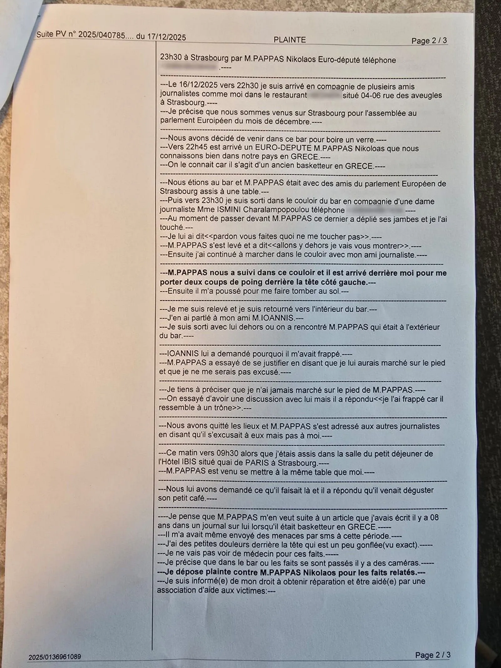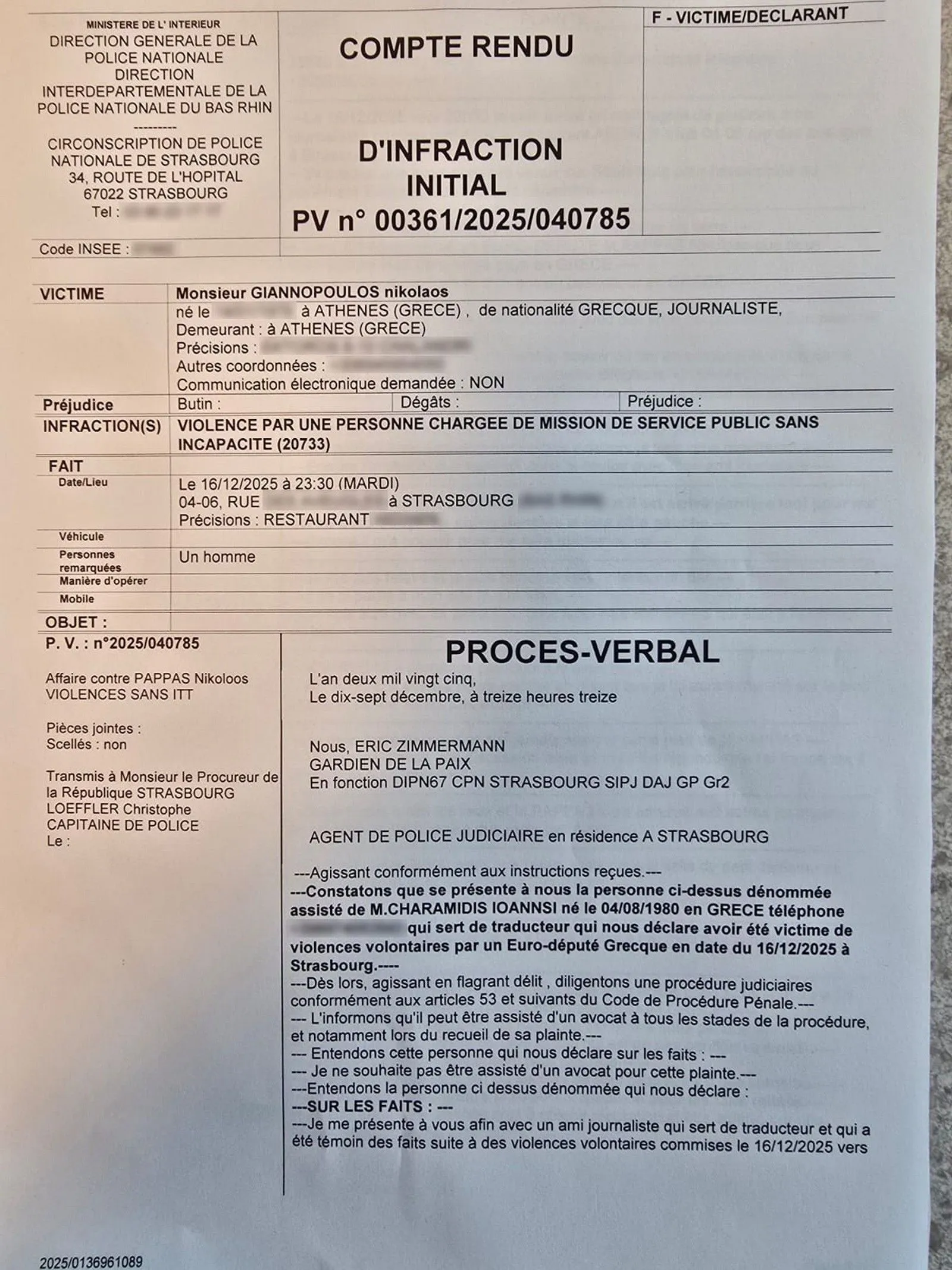 Σήμερα 17 Δεκεμβρίου, ο Νίκος Γιαννόπουλος, υπέβαλε μήνυση στην αστυνομική διοίκηση Αλσατίας, που εδρεύει στο Στρασβούργο και περιέγραψε αναλυτικά το περιστατικό στον αστυνομικό, που του πήρε κατάθεση.