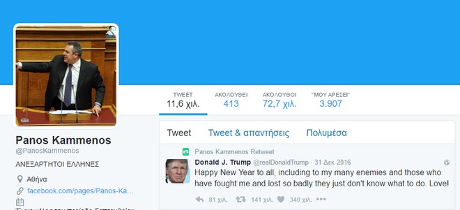 Μπορεί για πολλούς Ευρωπαίους πολιτικούς η ανάδειξη Τραμπ στη θέση του προέδρου των ΗΠΑ να προκάλεσε παγωμάρα και αβεβαιότητα, όχι όμως, όπως όλα δείχνουν και για τον υπουργό Άμυνα, Πάνο Καμμένο. Ο πρόεδρος των ΑΝΕΛ, μέσα από το λογαριασμό του στο twitter, έκανε retweet τη Δευτέρα, το μήνυμα του Ν τόναλντ Τραμπ εν όψει της Πρωτοχρονιάς.