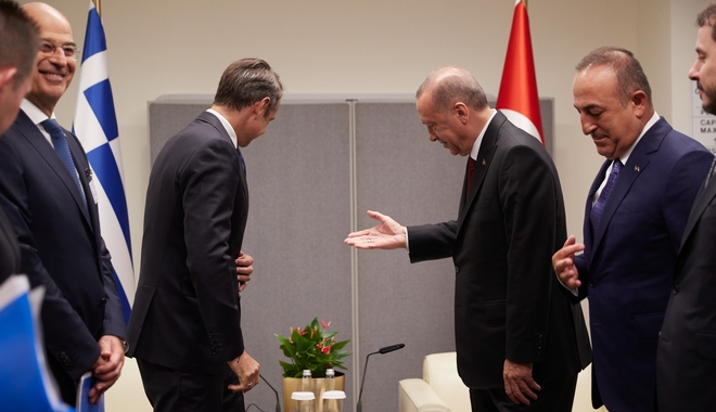 Οι δύο άνδρες αντάλλαξαν χειραψία στον προθάλαμο μακριά από τις κάμερες με τον κ. Μητσοτάκη να λέει στον Τούρκο πρόεδρο “χαίρομαι που σας συναντώ και με την καινούρια μου ιδιότητα”,