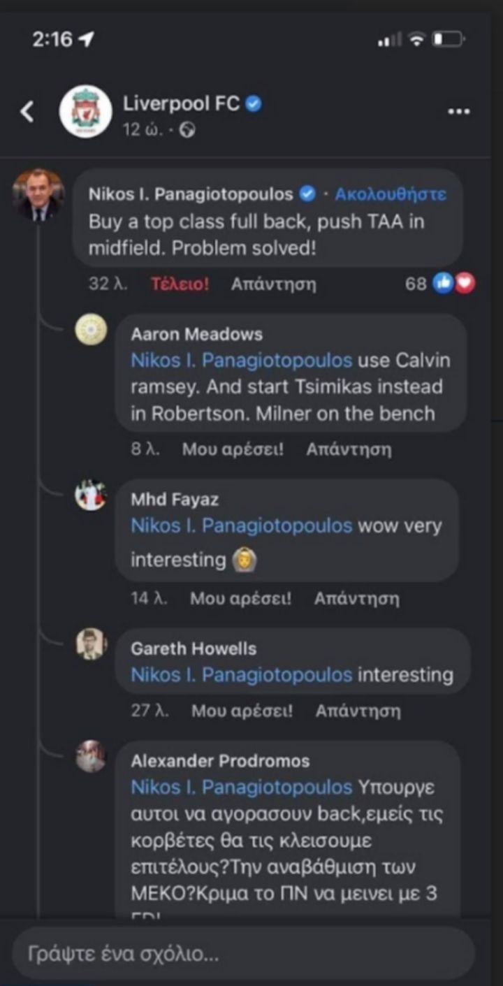 Σύμφωνα με το SPORT24, βλέποντας την κατάσταση σύγχυσης και πανικού της αγγλικής άμυνας, ο Υπουργός Άμυνας, Νίκος Παναγιωτόπουλος, αποφάσισε να επέμβει μέσω τοποθέτησής του στον επίσημο λογαριασμό της Λίβερπουλ στο Facebook.