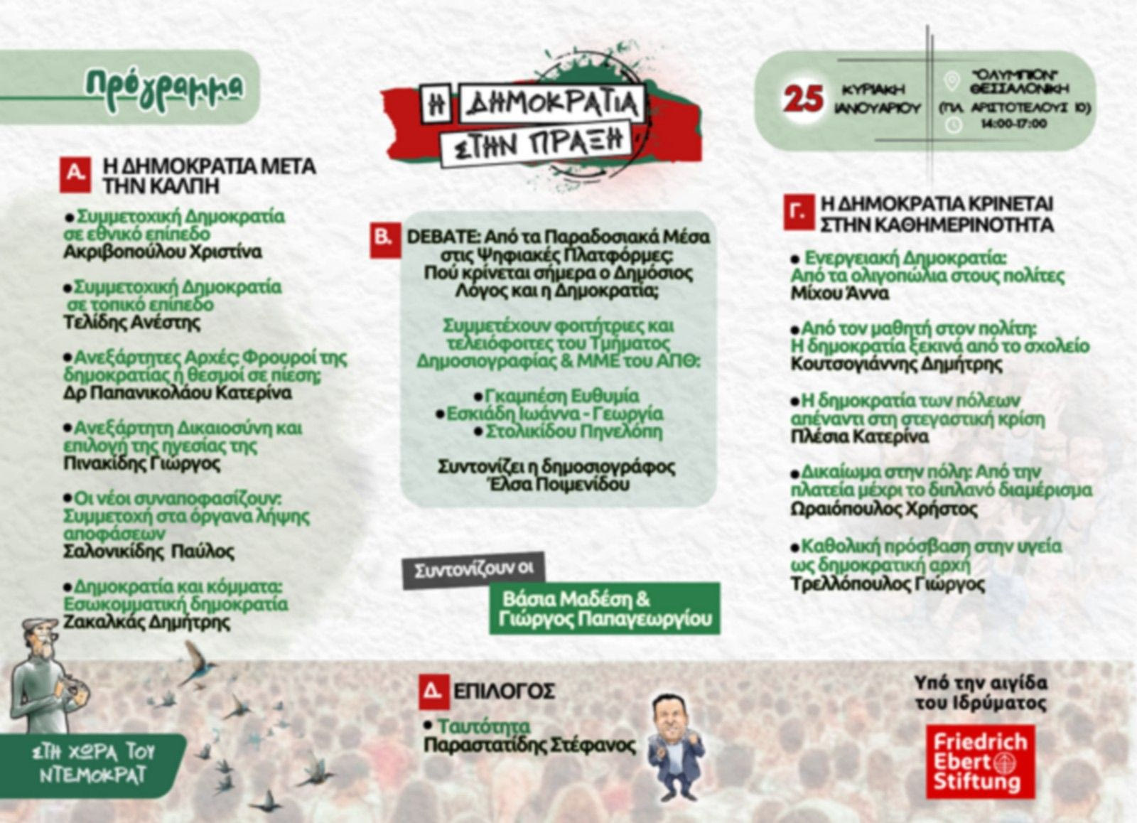 Μετά την επιτυχημένη εκδήλωση στην Αθήνα υπό την αιγίδα του Ιδρύματος Friedrich-Ebert-Stiftung (FES Ελλάδα), με θέμα “Δημοκρατία Vs Αυταρχισμός: η σύγκρουση που θα κρίνει το μέλλον”, ο Ντέμοκρατ συνεχίζει τον δημόσιο διάλογο για τις μεγάλες δημοκρατικές προκλήσεις της εποχής μας και μεταφέρει τη συζήτηση στη Θεσσαλονίκη, την Κυριακή 25 Ιανουαρίου στο Ολύμπιον (Πλατεία Αριστοτέλους), από τις 14:00 έως τις 17:00.