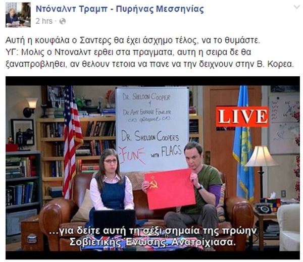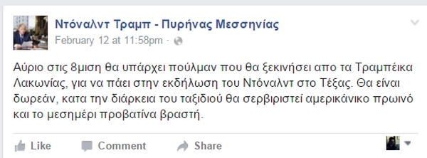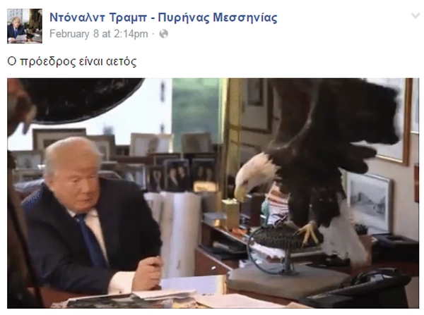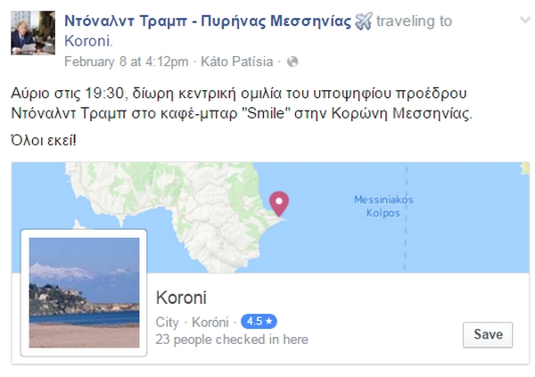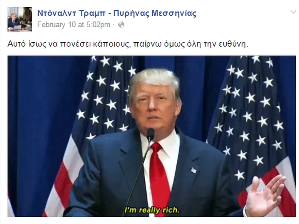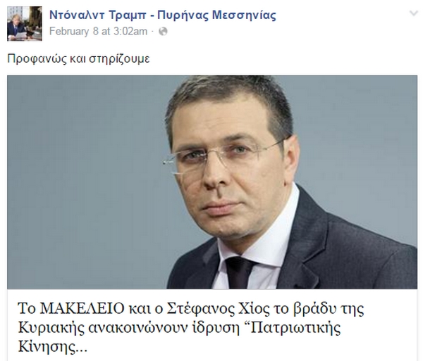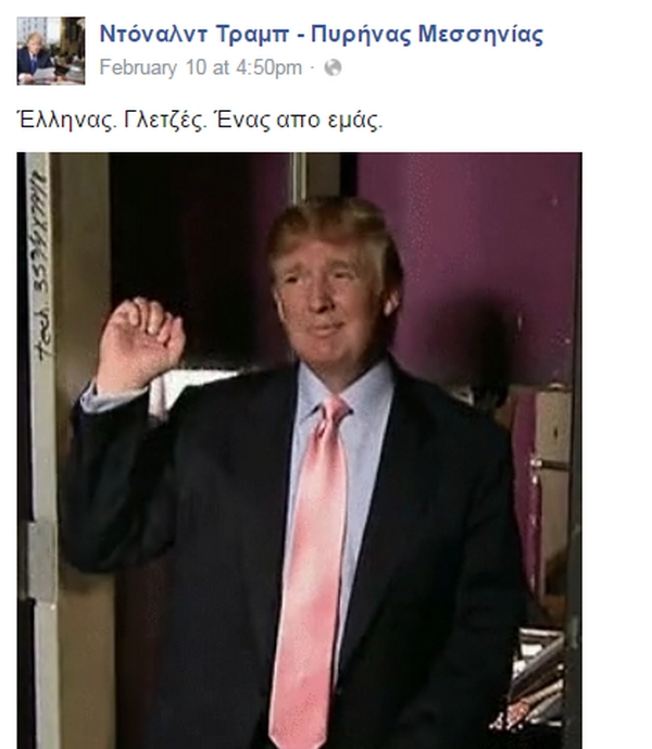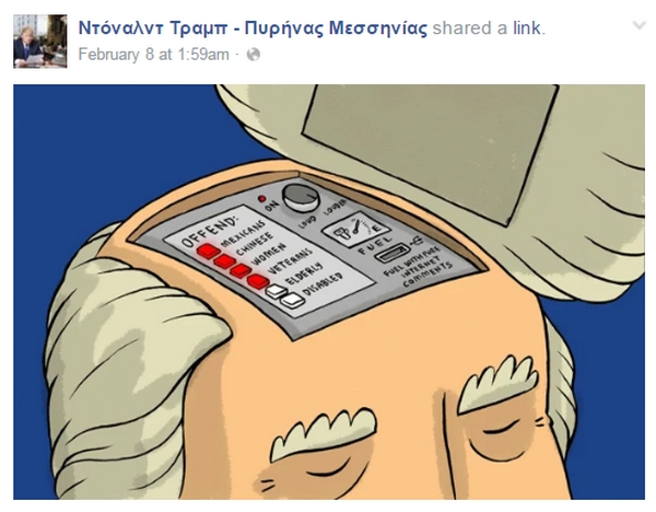 Πρόσφατα εντοπίσαμε και μια σελίδα στο Facebook που στοχεύει φυσικά, στο να καυτηριάσει τις πολιτικές θέσεις του υποψηφίου των Ρεπουμπλικανών, ενώ έχει και ελληνικό “άρωμα”. Υπενθυμίζουμε πως την περασμένη εβδομάδα ο δισεκατομμυριούχος Ντόναλντ Τραμπ επωφελήθηκε από τον θυμό των αμερικανών ψηφοφόρων εναντίον των παραδοσιακών πολιτικών για να κερδίσει τις προκριματικές εκλογές για το προεδρικό χρίσμα των ρεπουμπλικανών στην ανατολική πολιτεία του Νιού Χάμσαϊρ σήμερα, ενώ ο Μπέρνι Σάντερς υπερίσχυσε της Χίλαρι Κλίντον για το χρίσμα του Δημοκρατικού Κόμματος.