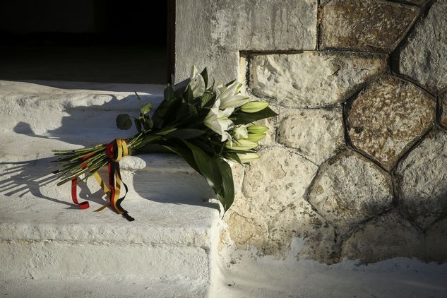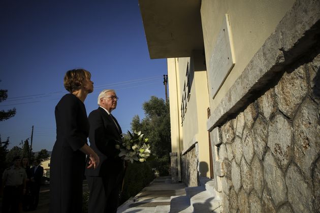 Ο κ. Στάινμαϊερ άφησε στο χώρο λίγα λευκά λουλούδια, ένας τρόπος για να ζητήσει συγγνώμη για όσα διέπραξαν οι συμπατριώτες του κατά τη διάρκεια της κατοχής στη χώρα μας.