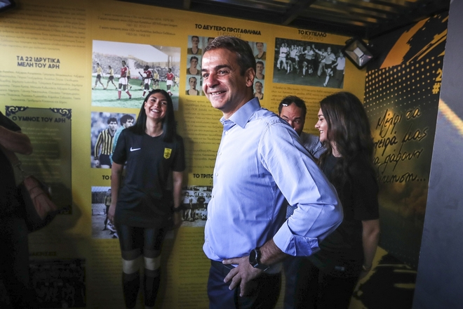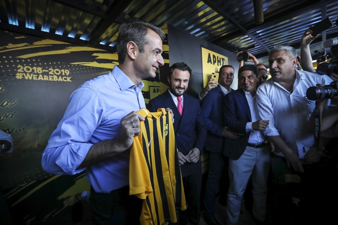 Ο Θόδωρος Καρυπίδης, πρόεδρος του Άρη, χάρισε στον Κυριάκο Μητσοτάκη μια φανέλα με τον αριθμό "1" σε μια κίνηση συμβολική.