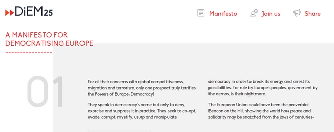 “Ερχόμαστε από κάθε γωνιά της Ευρώπης και μας ενώνουν διαφορετικές γλώσσες, πολιτισμοί, πολιτικές ταυτότητες, ιδεολογίες, χρώμα δέρματος, φύλο, φιλοσοφικές και θρησκευτικές πεποιθήσεις, ιδέες για το τι εστί καλή καγαθή κοινωνία. Πάνω απ΄όλα μας ενώνει η αποφασιστικότητα να αντιταχθούμε σε ένα ευρωπαϊκό κατεστημένο το οποίο αντιμετωπίζει την αυθεντική δημοκρατία με περιφρόνηση”, αναφέρει στο μανιφέστο του ο Γιάνης Βαρουφάκης.