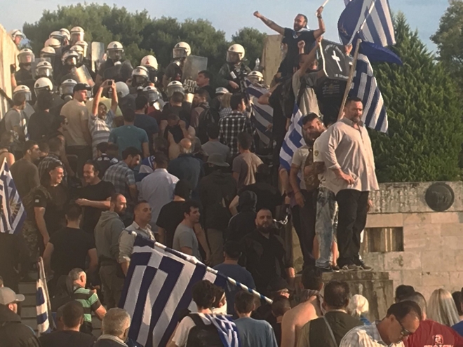 Λίγο μετά τις 19:00 το απόγευμα, μια ομάδα από το συλλαλητήριο για τη Μακεδονία επιχείρησε για δεύτερη φορά να ανεβεί τα σκαλιά της Βουλής πίσω από το μνημείο του Αγνώστου Στρατιώτη. Πανταχού παρών ο βουλευτής της χρυσής αυγής Γιάννης Λαγός.