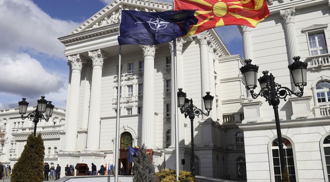 Η σημαία του ΝΑΤΟ κυματίζει από σήμερα, δίπλα στη σημαία της μελλοντικής Βόρειας Μακεδονίας, στον προαύλιο χώρο του κτιρίου της κυβέρνησης της χώρας.