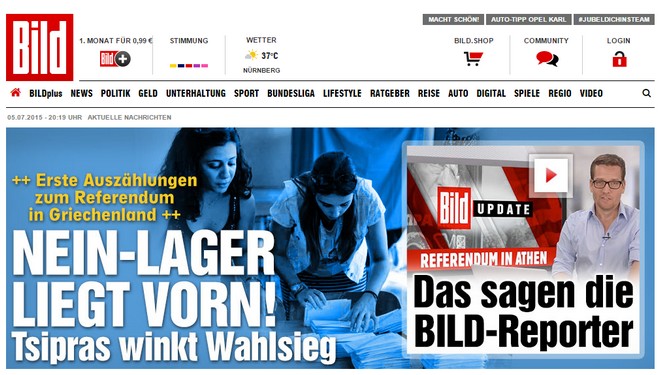 “Οι Έλληνες απορρίπτουν τις μεταρρυθμίσεις. Πανηγυρισμοί στο στρατόπεδο του ΟΧΙ” γράφει η γερμανική εφημερίδα Die Welt, όπως και η Bild που κάνει λόγο για επιτυχία του Αλέξη Τσίπρας με το σαφές προβάδισμα στο στρατόπεδο του ΟΧΙ.