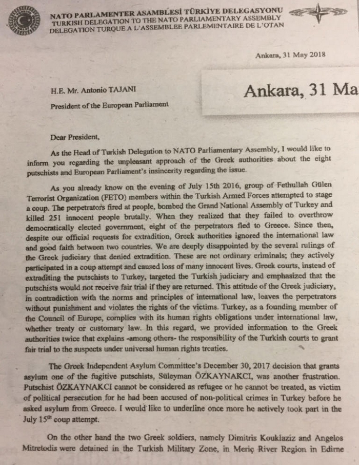 Αποστολέας της επιστολής με ημερομηνία 31 Μαϊου, που δημοσιεύουν τα “Νέα”, είναι ο πρόεδρος της κοινοβουλευτικής επιτροπής της Τουρκίας στο ΝΑΤΟ, Αχμέτ Μπεράτ Τζονκάρ. Με αυτό τον τρόπο η Τουρκία “απαντά” στο ψήφισμα του Ευρωπαϊκού Κοινοβουλίου για την απελευθέρωση των δύο Ελλήνων στρατιωτικών, καθώς το εν λόγω έγγραφο εστάλη αμέσως μετά τη Σύνοδο Κορυφής στη Βουλγαρία που είχε ξεκινήσει στις 26 Μαίου.