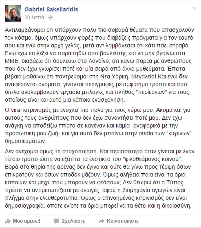 Έντονη αντίδραση του πρώην κυβερνητικού εκπροσώπου του ΣΥΡΙΖΑ Γαβριήλ Σακελλαρίδη, έπειτα από σειρά δημοσιευμάτων που είδαν το φως της δημοσιότητας και αφορούσαν την προσωπική του ζωή. Ο υποψήφιος για τη δημαρχία της Αθήνας το 2014, ανήρτησε μια απάντηση στο προσωπικό του προφίλ στο facebοok, στην οποία κάνει λόγο για “viral κιτρινισμό” και εξηγεί πως “βορά στα θηρία της αρένας δεν έγινα και ούτε θα γίνω προς τέρψη όσων επικροτούν και όσων αποδοκιμάζουν”.