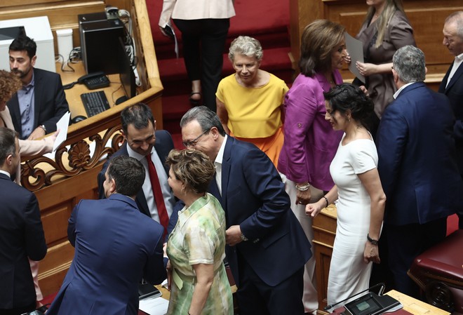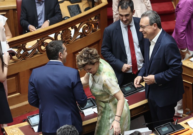 Έχοντας δίπλα του την Όλγα Γεροβασίλη, η οποία κατά την ψηφοφορία της Πολιτικής Γραμματείας του ΣΥΡΙΖΑ προτάθηκε για τη θέση της αντιπροέδρου της Βουλής και τον Σωκράτη Φάμελλο, ο οποίος επίσης προτάθηκε για πρόεδρος της ΚΟ του ΣΥΡΙΖΑ, ο Αλέξης Τσίπρας συνομίλησε με άλλους βουλευτές, με τον φωτογραφικό φακό να απαθανατίζει μεταξύ άλλων τη χειραψία του με τη Ντόρα Μπακογιάννη.