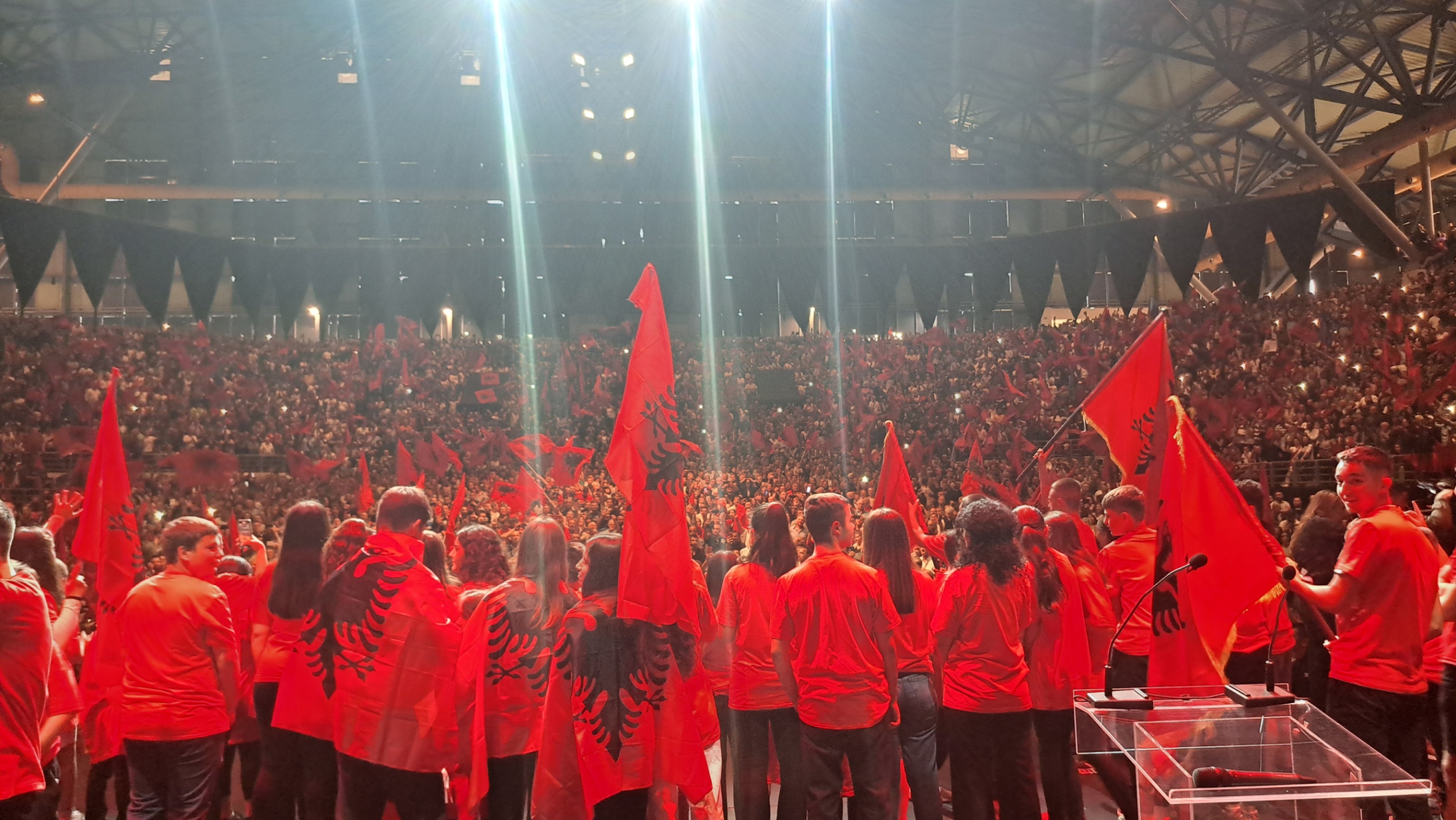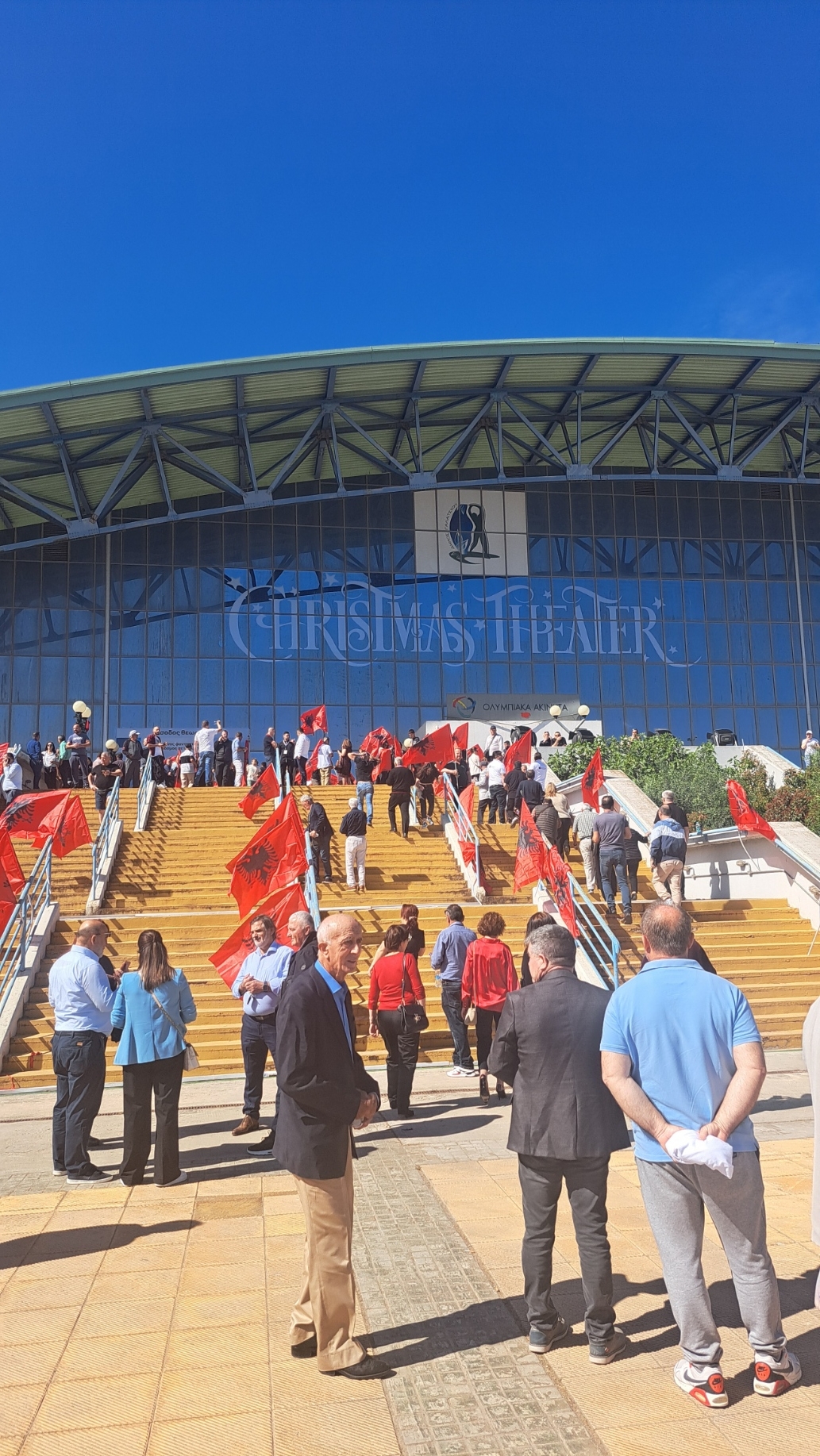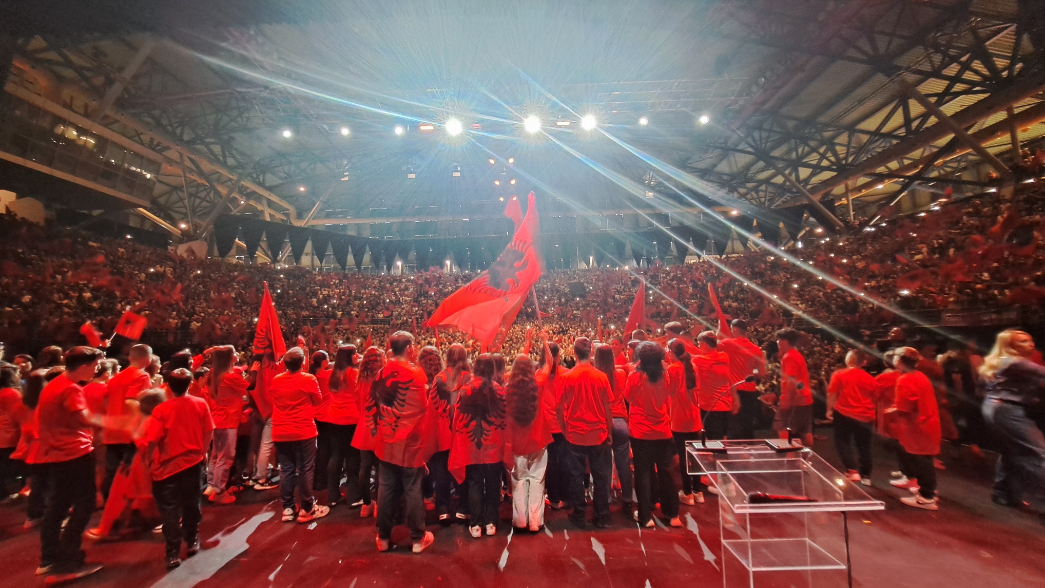Το Christmas Theatre βάφτηκε κόκκινο, με εκατοντάδες σημαίες της Αλβανίας, αλλά και της Ελλάδας, ακόμη και της Ευρωπαϊκής Ένωσης στα χέρια μικρών παιδιών, μέχρι και μπλουζάκια για τον Έντι Ράμα.