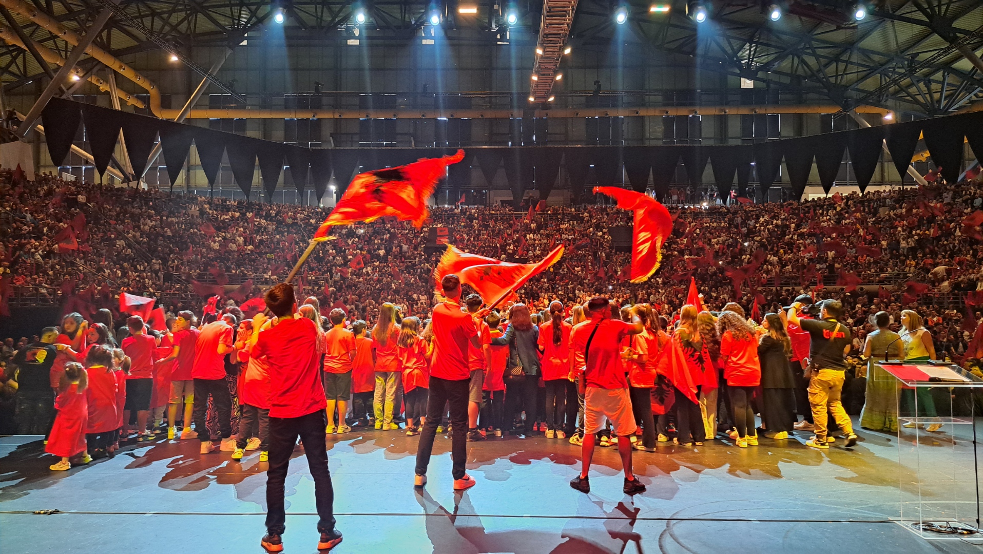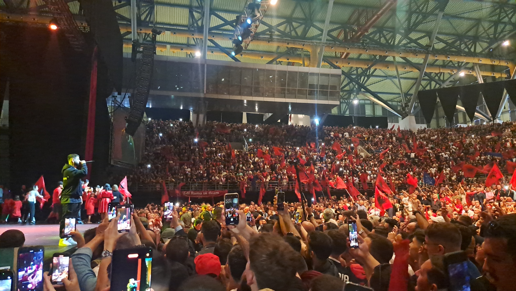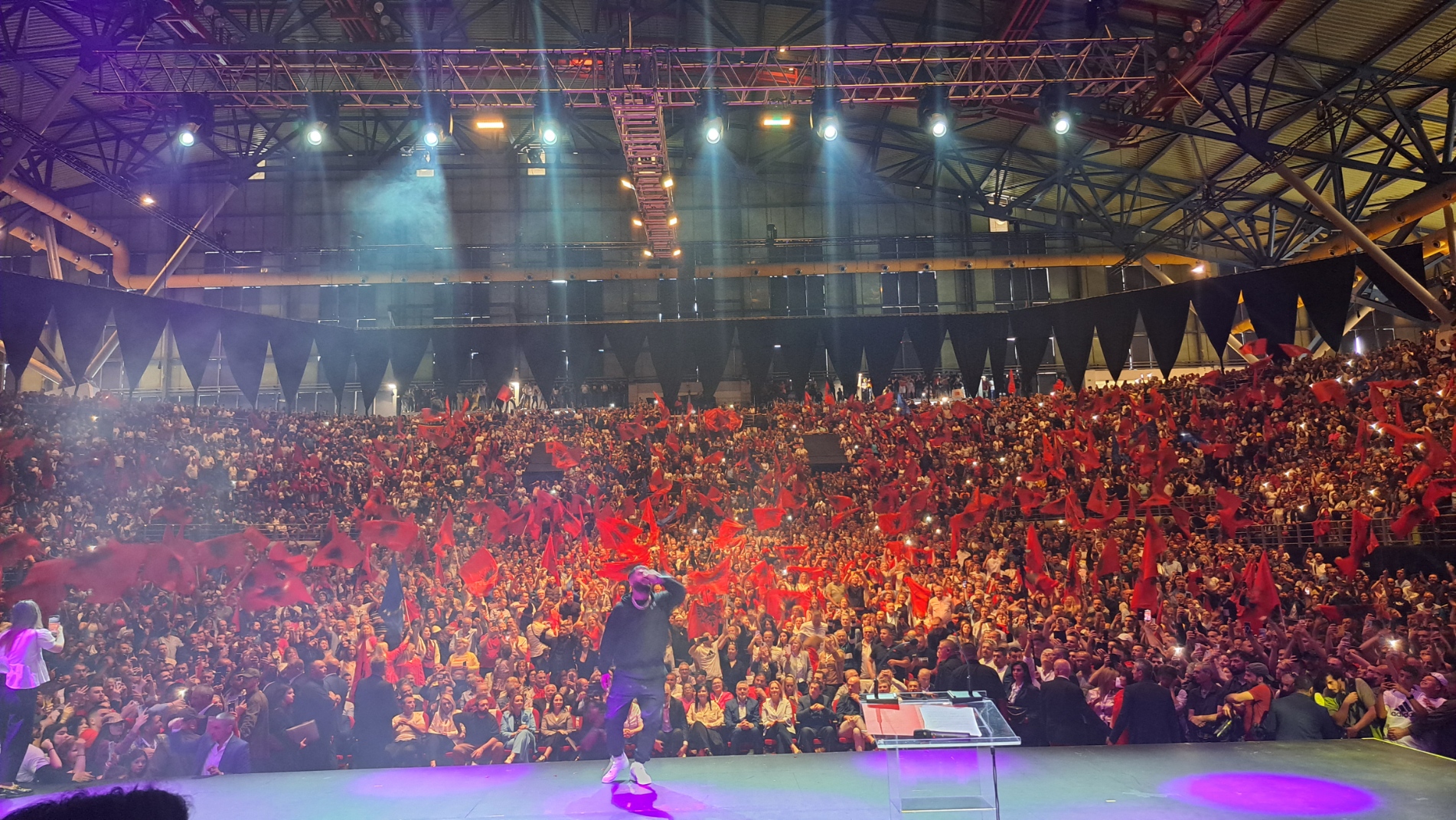 Το Christmas Theatre βάφτηκε κόκκινο, με εκατοντάδες σημαίες της Αλβανίας, αλλά και της Ελλάδας, ακόμη και της Ευρωπαϊκής Ένωσης στα χέρια μικρών παιδιών, μέχρι και μπλουζάκια για τον Έντι Ράμα.