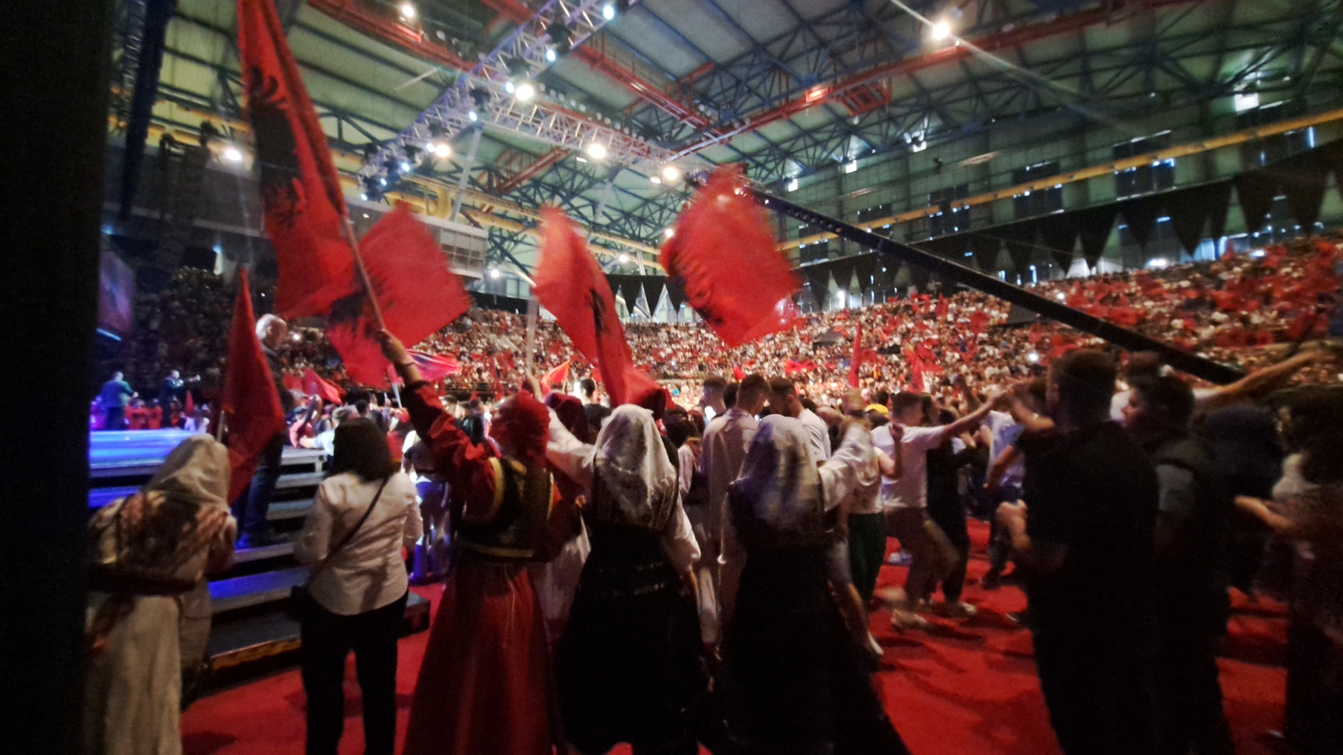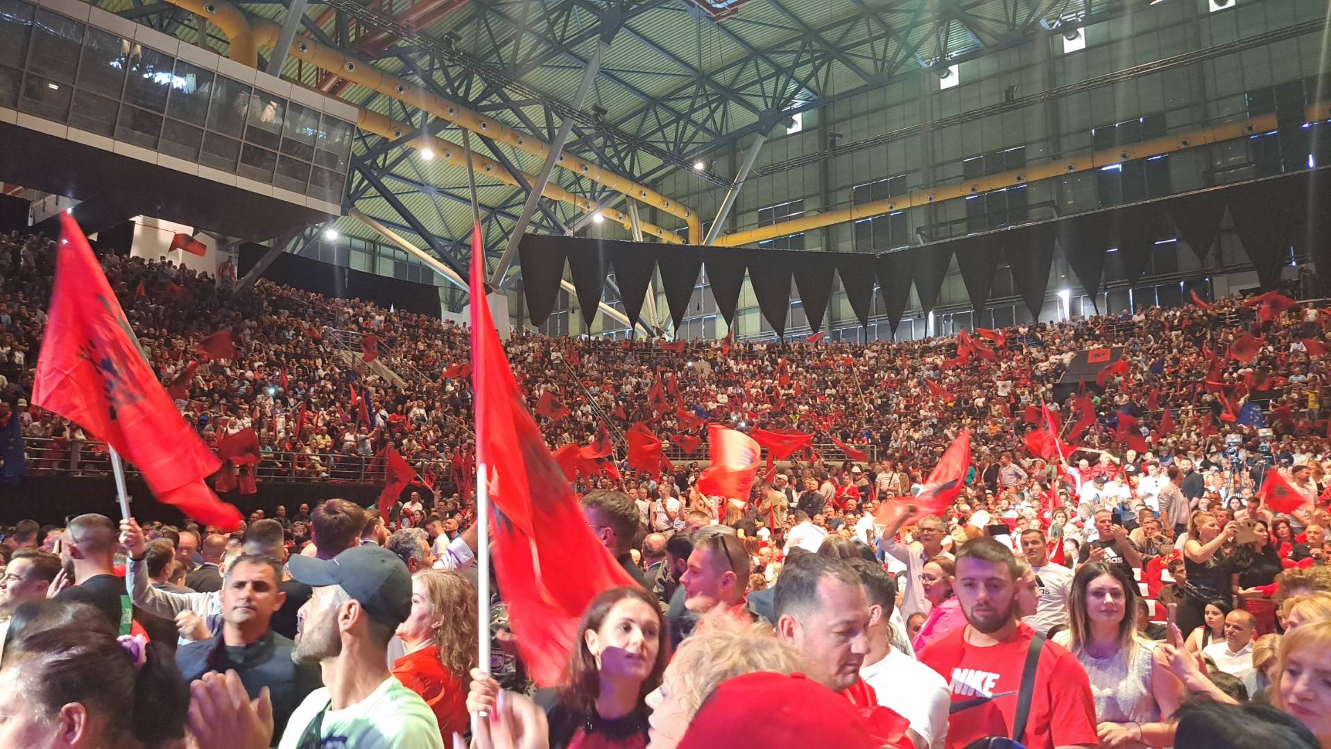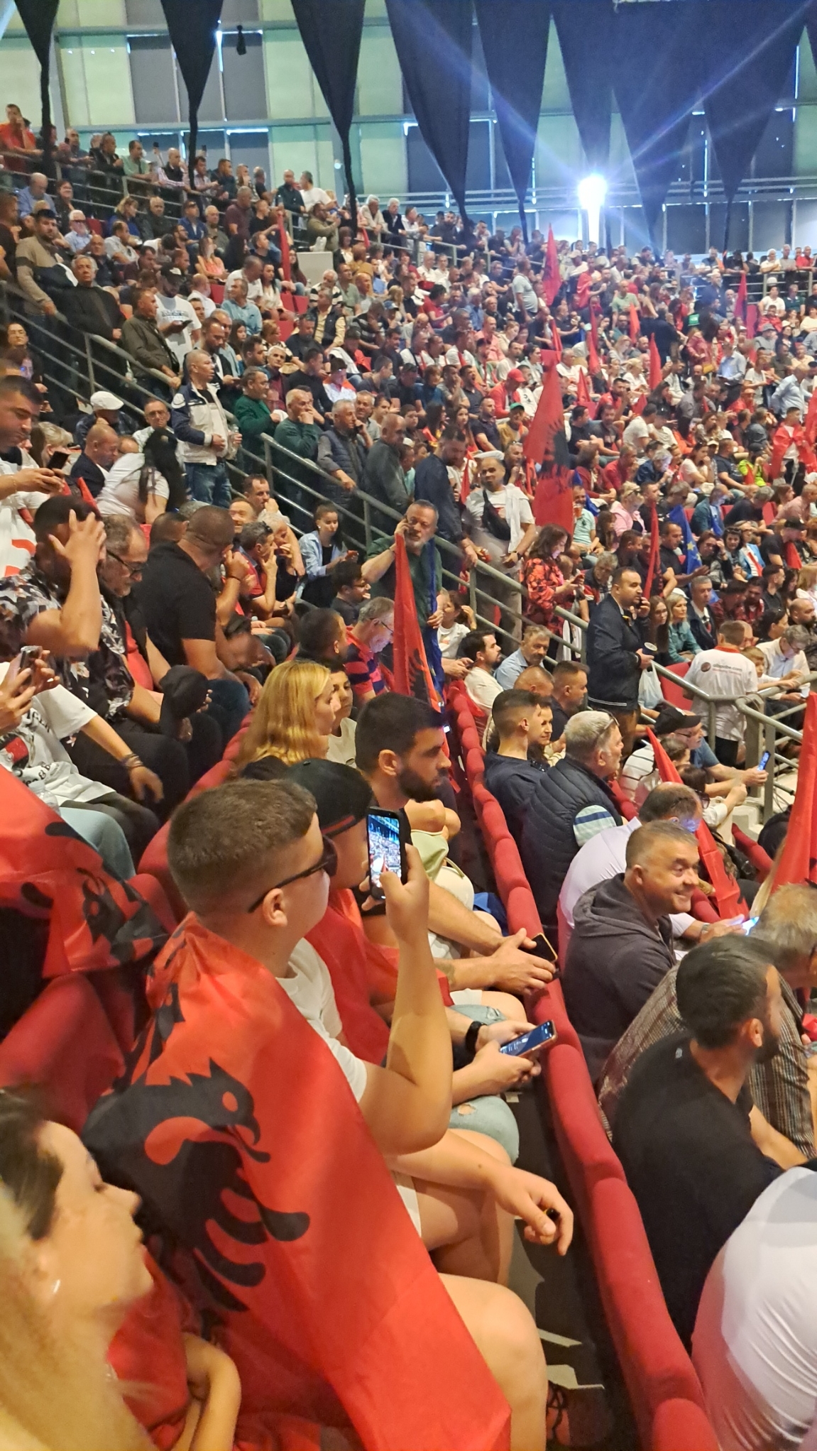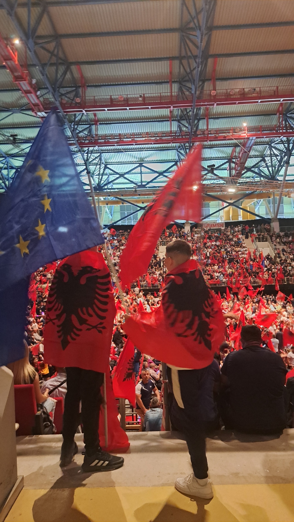 Αλβανικές σημαίες κυμάτιζαν στις κατάμεστες -πια- εξέδρες και κάποια “Έντι, Έντι” ακούγονταν τακτικά από το πλήθος, για να δονήσουν τον χώρο, όσο ο χρόνος μετρούσε αντίστροφα για τη στιγμή που ο Αλβανός πρωθυπουργός θα ανέβαινε στη σκηνή.
