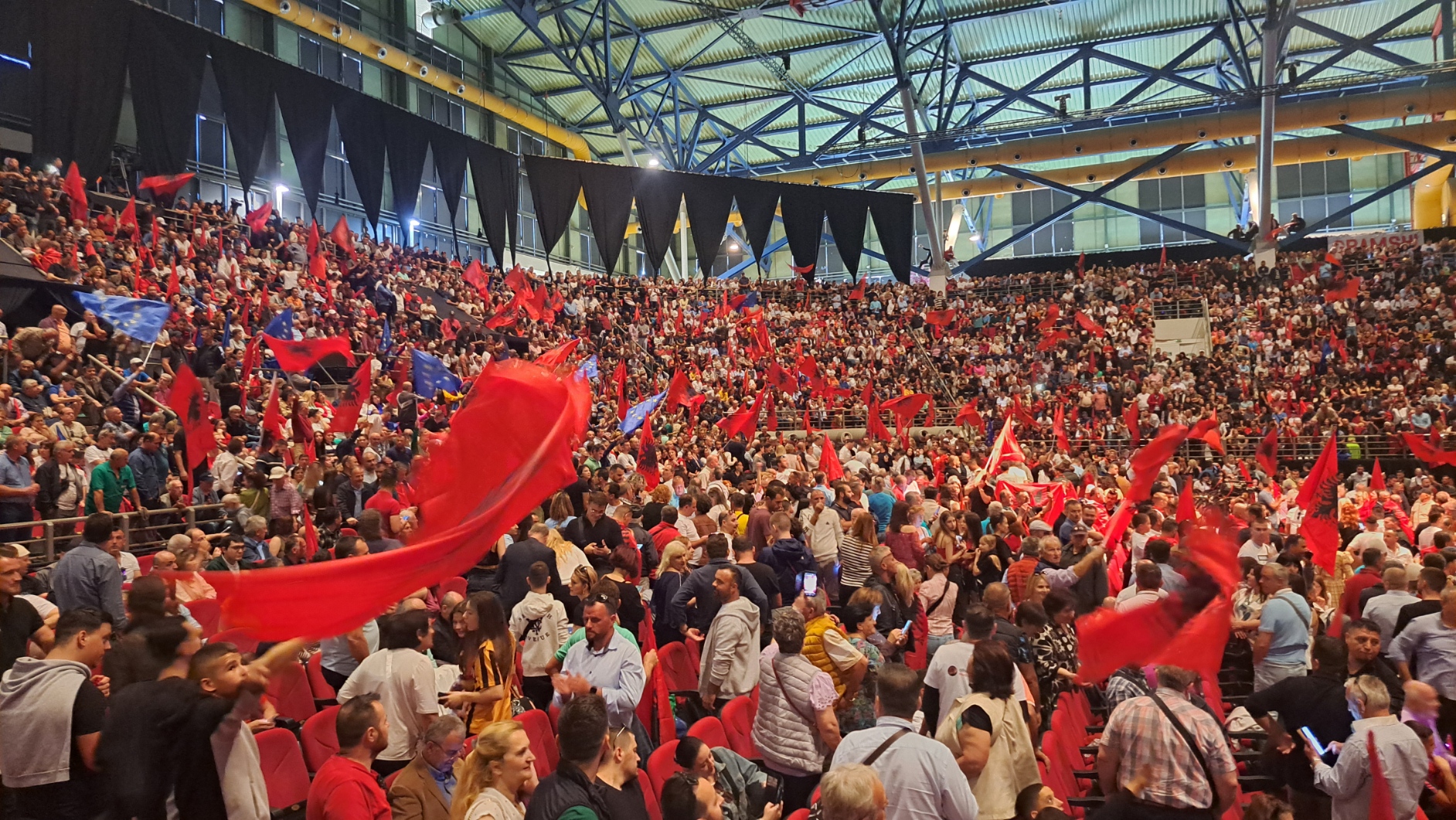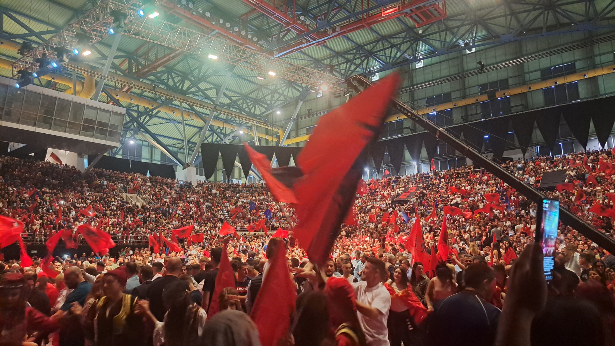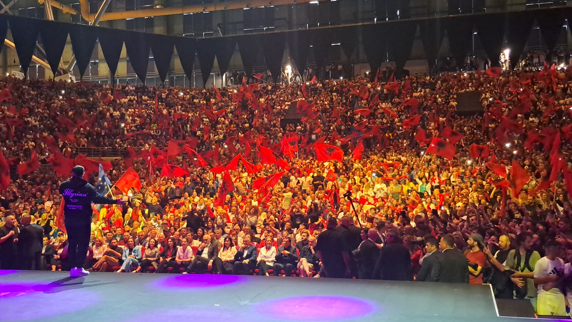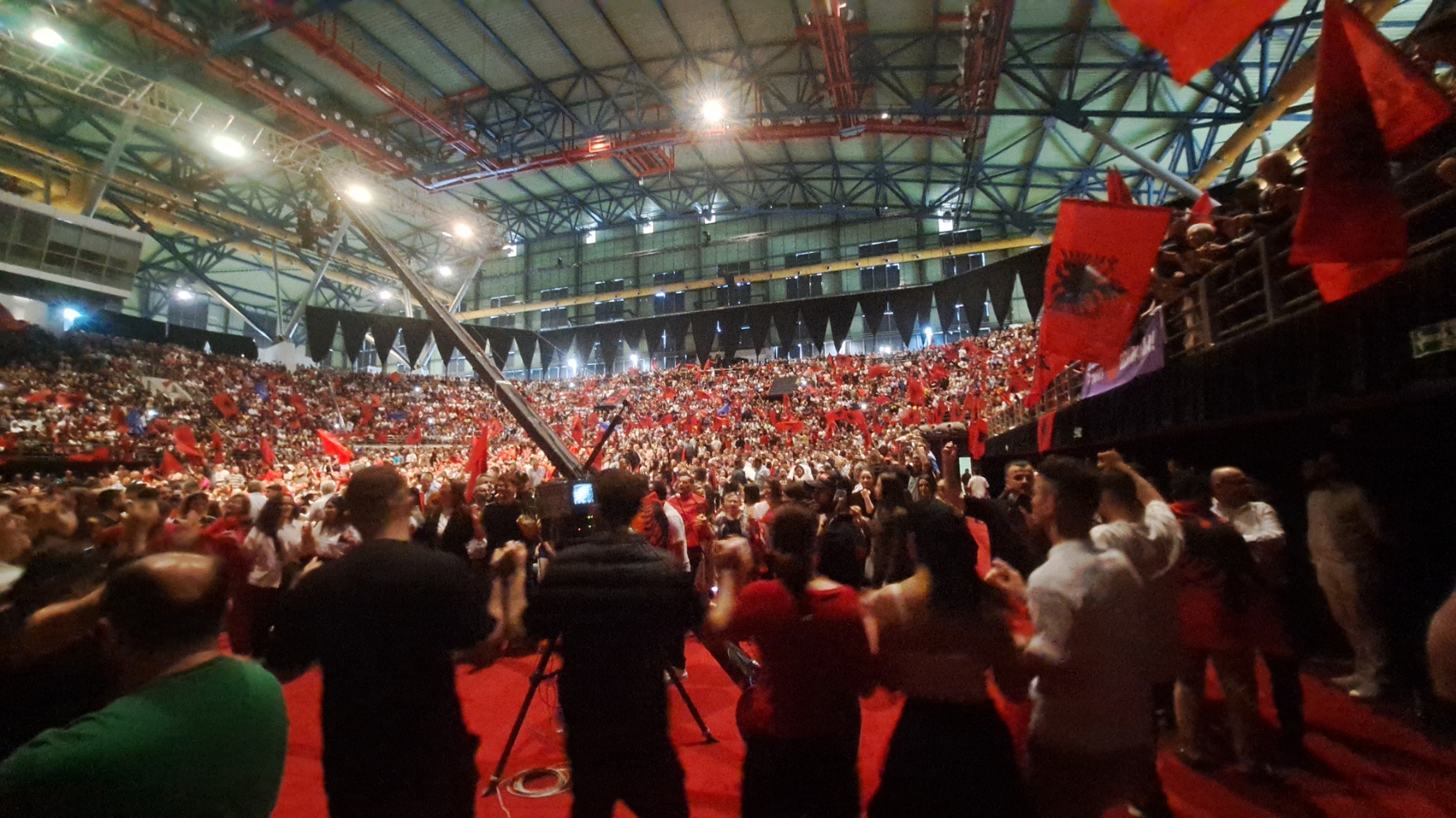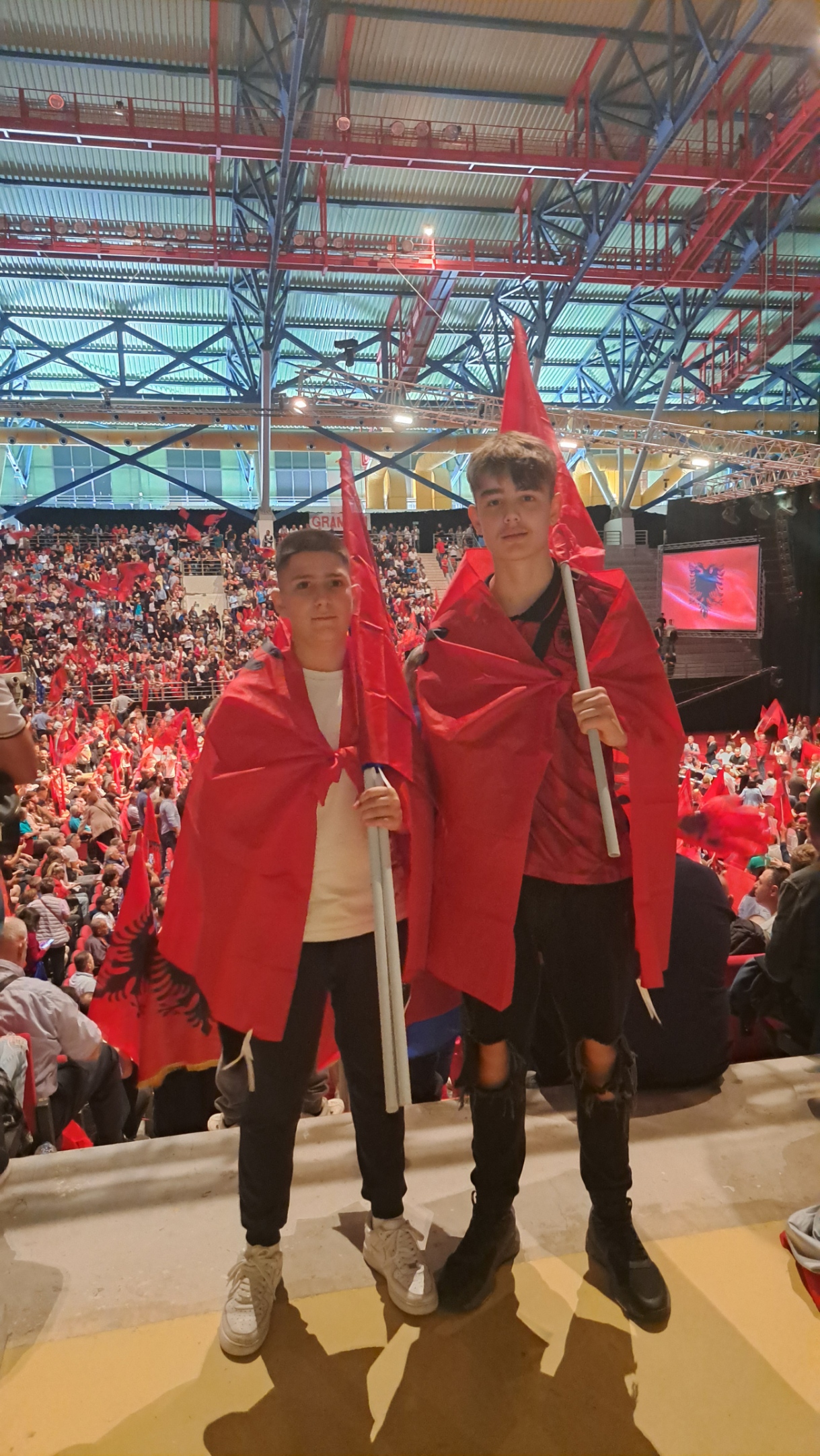 Αλβανικές σημαίες κυμάτιζαν στις κατάμεστες -πια- εξέδρες και κάποια “Έντι, Έντι” ακούγονταν τακτικά από το πλήθος, για να δονήσουν τον χώρο, όσο ο χρόνος μετρούσε αντίστροφα για τη στιγμή που ο Αλβανός πρωθυπουργός θα ανέβαινε στη σκηνή.