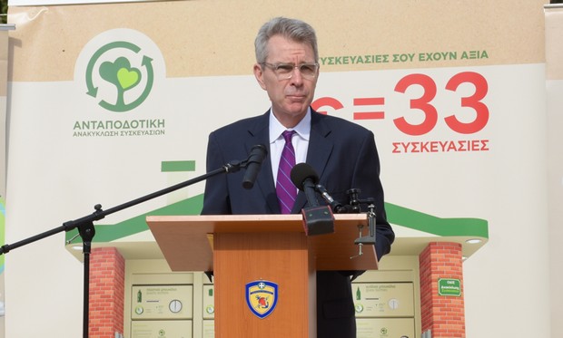 «Η σημερινή τελετή σηματοδοτεί μια ακόμα επιτυχία που υπογραμμίζει την ισχύ των πολυεπίπεδων σχέσεων ΗΠΑ-Ελλάδα», τόνισε ο πρεσβευτής των ΗΠΑ στην Ελλάδα Τζέφρι Πάιατ κατά τα εγκαίνια της πρώτης μονάδας ανακύκλωσης στο στρατόπεδο «Παπάγου», παρουσία του υπουργού Εθνικής Άμυνας Πάνου Καμμένου.