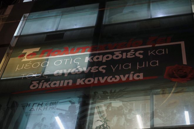 Το πανώ για που ανάρτησε στις 17 Νοεμβρίου το ΚΙΝ.ΑΛ για την επέτειο του Πολυτεχνείου, στα γραφεία του στην Χ.Τρικούπη Eurokinissi