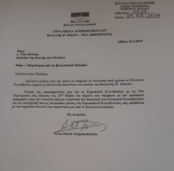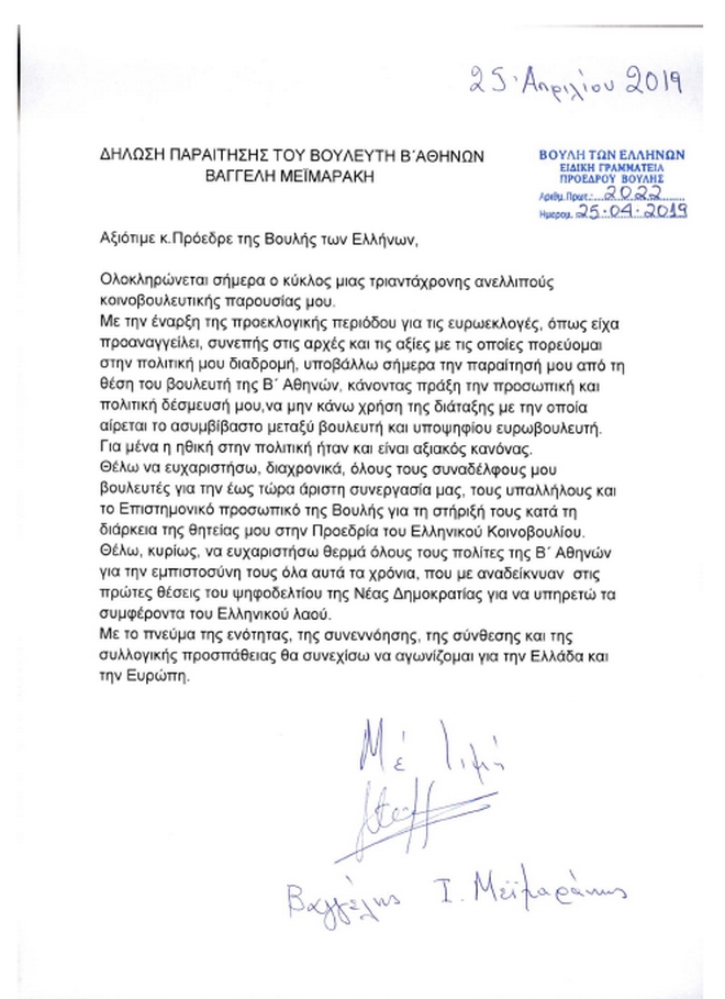 Ενόψει της υποψηφιότητας μου για το Ευρωπαϊκό Κοινοβούλιο με τη Νέα Δημοκρατία στις εκλογές της 26ης Μαϊου και παρόλο που σύμφωνα με τον πρόσφατα ψηφισμένο νόμο δεν συνιστά κώλυμα η ιδιότητα του Βουλευτή του Ελληνικού Κοινοβουλίου για την ανακήρυξη του ως υποψηφίου μέλους του Ευρωπαϊκού Κοινοβουλίου, σας υποβάλλω με την παρούσα επιστολή την παραίτηση μου από το βουλευτικό αξίωμα.