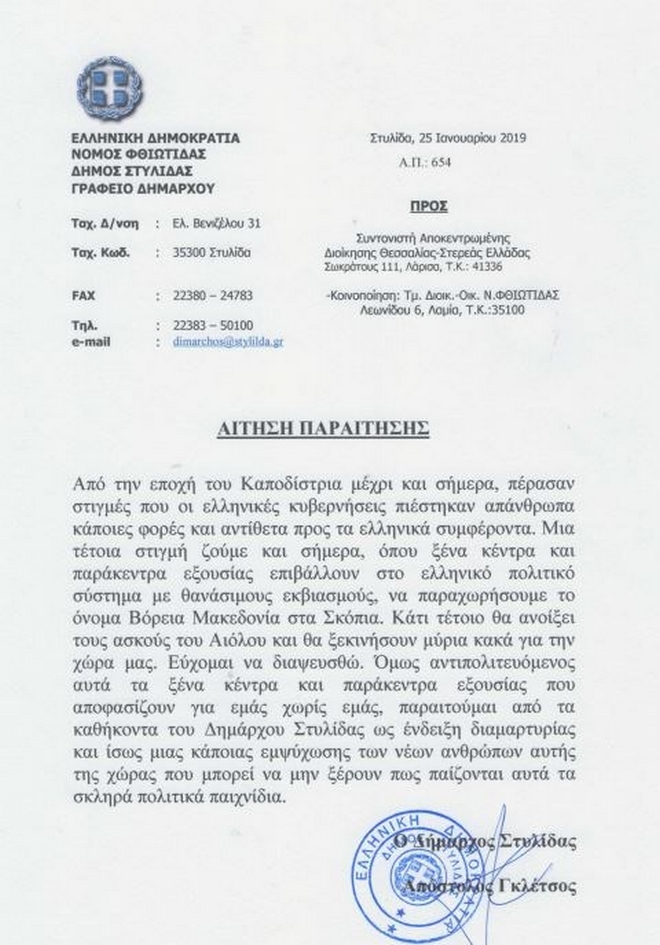 Με μια ανακοίνωσή του ο Απόστολος Γκλέτσος αποφάσισε να παραιτηθεί από δήμαρχος Στυλίδας αντιδρώντας με αυτόν τον τρόπο στην επικύρωση από την Ολομέλεια της Βουλής της συμφωνίας των Πρεσπών.