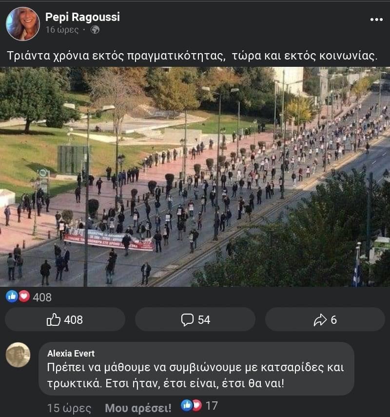 Η Αλεξία Έβερτ σε σχόλιό της σε ανάρτησή στα social media με φωτογραφία απο την συγκέντρωση του ΚΚΕ εγραψε: “πρέπει να μάθουμε να συμβιώνουμε με κατσαρίδες και τρωκτικά”.