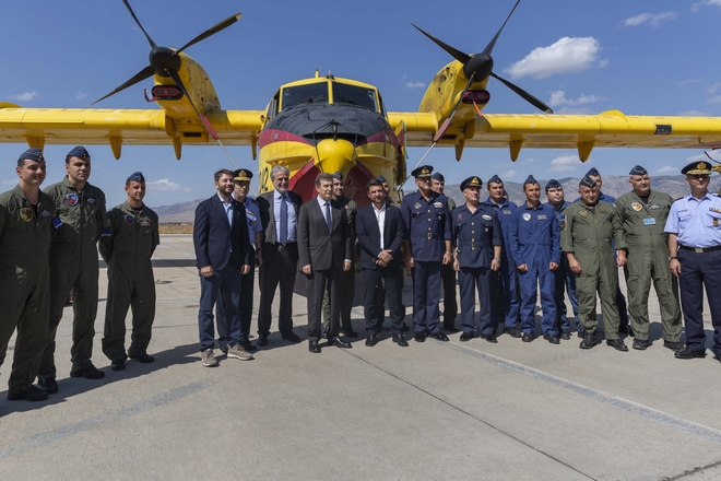 Και εδώ θέλω να συγχαρώ κύριοι Πτέραρχοι, θέλω να συγχαρώ το προσωπικό σας, τους άξιους χειριστές μας, οι οποίοι μέσα από αντίξοες συνθήκες, πολλές ώρες, δύσκολες καιρικές συνθήκες πέταξαν πάνω από πολύ δύσκολα ανάγλυφα, έδωσαν μάχη και περιόρισαν τις πυρκαγιές και τελικά τις σβήσαμε. Ακόμα και τις πολύ μεγάλες, οι οποίες απείλησαν οικισμούς, απείλησαν πόλεις, αλλά εμείς ήμασταν εκεί. Ήταν όλοι εκεί. Ο Στρατός, η Αεροπορία, το Λιμενικό, το Ε.Κ.Α.Β., η Τοπική Αυτοδιοίκηση, οι εθελοντές, η Πολιτική Προστασία και τελικά οι πυροσβέστες μας. Όλοι μαζί. Αυτό σημαίνει οργανωμένο κράτος. Και το αποδείξαμε ότι μπορούμε να είμαστε μια οργανωμένη Πολιτεία, η οποία ξέρει να απαντά αποτελεσματικά και αποφασιστικά στις κρίσεις. Αυτό είναι το επίτευγμά μας για φέτος. Και πρέπει να το συνεχίσουμε. Θέλω λοιπόν να σας συγχαρώ αγαπητοί φίλοι χειριστές και εσάς και τους τεχνικούς σας και τους διοικούντες ότι φέτος ήταν μια εκπληκτική χρονιά.