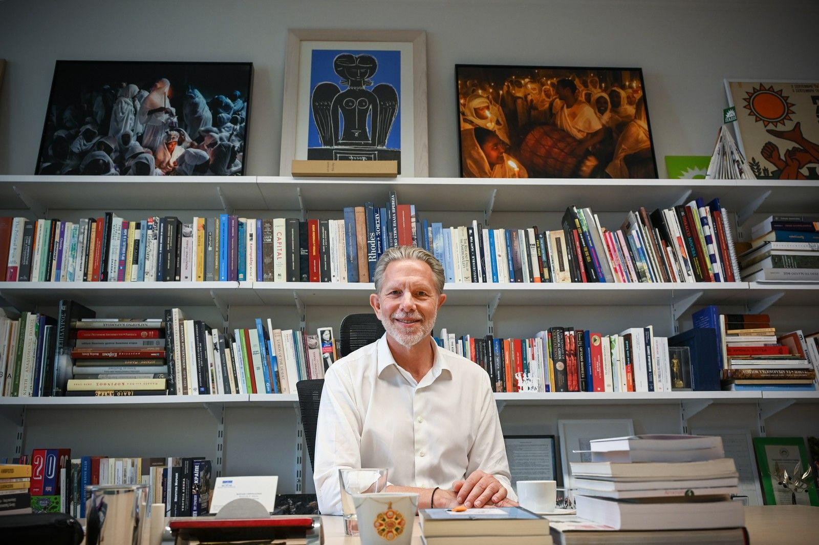 Στο γραφείο του (που μοιάζει περισσότερο με αίθουσα συσκέψεων), δεσπόζουν δεκάδες vintage αφίσες ΠΑΣΟΚ, επίσης δεκάδες βιβλία είναι στοιβαγμένα «για να μου υπενθυμίζουν ότι είναι τα επόμενα στη λίστα μου», ενώ στον εξωτερικό τοίχο είναι τυπωμένες μερικές φράσεις από το ιστορικό Συμβόλαιο με το Λαό του Ανδρέα Παπανδρέου και το 1981.