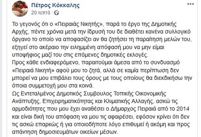 Ο Πέτρος Κόκκαλης απαντώντας στην ανακοίνωση του "Πειραιά Νικητή" ξεκαθάρισε ότι παραιτείται από τον Συνδυασμό, αλλά όχι και από τη θέση του Δημοτικού Συμβούλου.