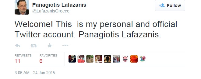 “Πρόκειται προφανώς, αναφέρει, περί κακόβουλης χρήσης του ονόματος, της φωτογραφίας και της ιδιότητας του υπουργού ΠΑΠΕΝ Π. Λαφαζάνη. Ο Π. Λαφαζάνης δεν διαθέτει κανέναν λογαριασμό στα μέσα κοινωνικής δικτύωσης και φυσικά ούτε στο twitter. Επομένως ουδεμία σχέση έχει ούτε με τον συγκεκριμένο λογαριασμό, ούτε με οποιονδήποτε άλλον και με το περιεχόμενό τους.”