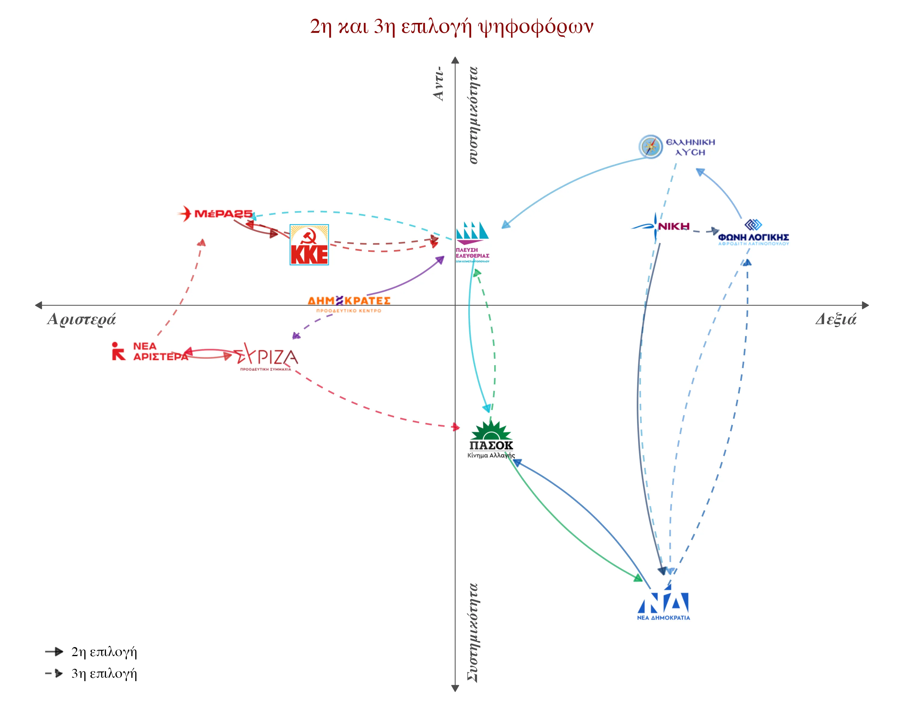 Τα αποτελέσματά μας ουσιαστικά επαληθεύουν το πρώτο, αλλά αντικρούουν το δεύτερο σκέλος αυτού του αφηγήματος. Πράγματι, οι ψηφοφόροι τους δεν βρίσκονται ιδεολογικά «ακραία» πιο δεξιά αυτών της ΝΔ. Στον αντίποδα, όμως, οι ψηφοφόροι ενώ μεταπηδούν σχετικά εύκολα σε περισσότερο ή λιγότερο αντισυστημικά κόμματα, δεν μεταπηδούν εύκολα πιο αριστερά/δεξιά. Τα (ακρο)δεξιά κόμματα, λοιπόν, έχουν κατά πάσα πιθανότητα ήδη απορροφήσει όσους ψηφοφόρους ενδιαφέρονταν να βρεθούν πιο δεξιά αλλά κυρίως όσους είναι πιο αντισυστημικοί. Ίσως, μάλιστα, θα ήταν πιο πιθανή η αντίστροφη μετακίνηση, προς τη ΝΔ, αφού και στα τρία αντισυστημικά κόμματα της δεξιάς οι ψηφοφόροι τους θεωρούν τη ΝΔ ως μια από τις δύο εναλλακτικές τους, ενώ για αυτούς της ΝΔ η πρώτη εναλλακτική τους είναι το ΠΑΣΟΚ.