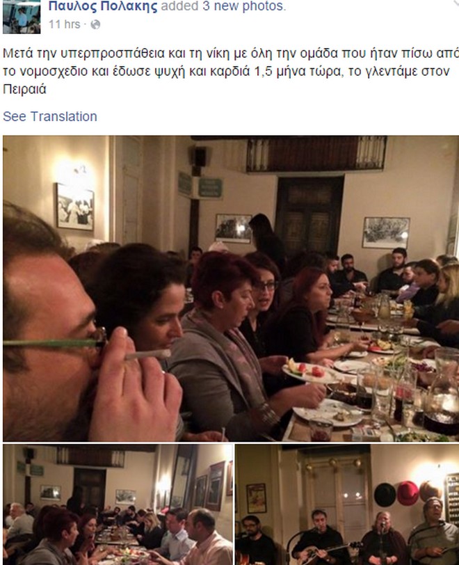 Την αποκάλυψη την έκανε ο ίδιος μέσω του προσωπικού του λογαριασμού στο facebook. “Μετά την υπερπροσπάθεια και τη νίκη με όλη την ομάδα που ήταν πίσω από το νομοσχέδιο και έδωσε ψυχή και καρδιά 1,5 μήνα τώρα, το γλεντάμε στον Πειραιά”, ήταν η ανάρτηση του κ. Πολάκη.
