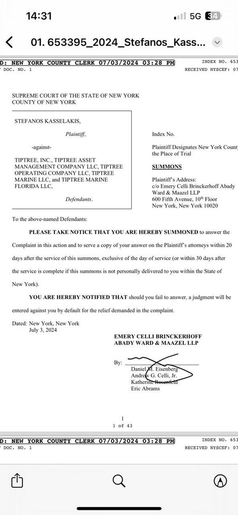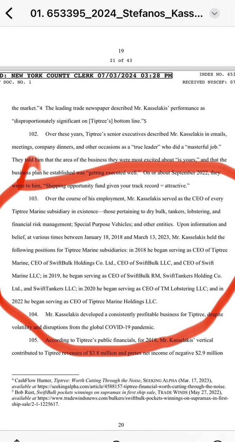 “Κατά τη διάρκεια της απασχόλησής του στην Tiptree, μεταξύ 18 Ιανουαρίου 2018 και 13 Μαρτίου 2023 ο ΣΚ διετέλεσε Διευθύνων Σύμβουλος (CEO) σε ΚΑΘΕ ΘΥΓΑΤΡΙΚΗ που υπήρχε στην Tiptree Marine – δηλαδή όσων αφορούν ξηρό φορτίο, δεξαμενόπλοια, αστακούς, διαχείριση χρηματοοικονομικού κινδύνου, oχήματα ειδικού σκοπού και άλλες οντότητες”. Αυτά τα λέει αυτολεξεί ο ίδιος σε δικόγραφο που κατέθεσε στις 3 Ιουλίου 2024 στο Supreme Court της Νέας Υόρκης σε αγωγή του κατά της Tiptree (CASE 653395/2024, DOC. 1).