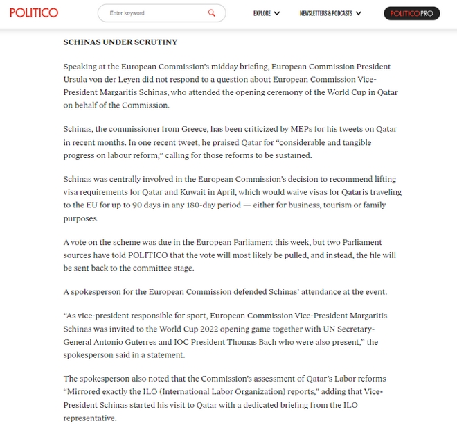 «Ο κ. Σχοινάς, επίτροπος από την Ελλάδα, έχει επικριθεί από τους ευρωβουλευτές για τα tweet του για το Κατάρ τους τελευταίους μήνες. Σε ένα πρόσφατο tweet, επαίνεσε το Κατάρ για “σημαντική και απτή πρόοδο στην εργασιακή μεταρρύθμιση”, ζητώντας να διατηρηθούν αυτές οι μεταρρυθμίσεις».
