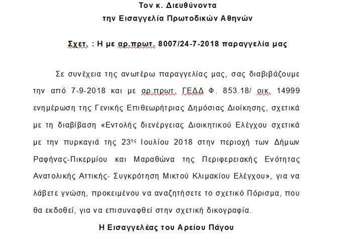 Σε συνέχεια της ανωτέρω παραγγελίας μας, σας διαβιβάζουμε την από 7-9-2018 και με αρ.πρωτ. ΓΕΔΔ Φ. 853.18/ οικ. 14999 ενημέρωση της Γενικής Επιθεωρήτριας Δημόσιας Διοίκησης, σχετικά με τη διαβίβαση «Εντολής διενέργειας Διοικητικού Ελέγχου σχετικά με την πυρκαγιά της 23ης Ιουλίου 2018 στην περιοχή των Δήμων Ραφήνας-Πικερμίου και Μαραθώνα της Περιφερειακής Ενότητας Ανατολικής Αττικής- Συγκρότηση Μικτού Κλιμακίου Ελέγχου», για να λάβετε γνώση, προκειμένου να αναζητήσετε το σχετικό Πόρισμα, που θα εκδοθεί, για να επισυναφθεί στην σχετική δικογραφία.