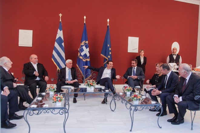 Χωρίς δηλώσεις αποχώρησαν από το Προεδρικό Μέγαρο ο πρωθυπουργός Αλέξης Τσίπρας, ο πρόεδρος της ΝΔ Κυριάκος Μητσοτάκης, ο υπουργός Εθνικής Άμυνας και πρόεδρος των ΑΝΕΛ Πάνος Καμμένος και ο γενικός γραμματέας του ΚΚΕ Δημήτρης Κουτσούμπας.