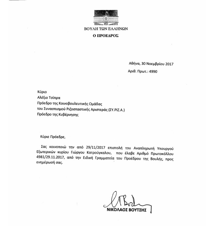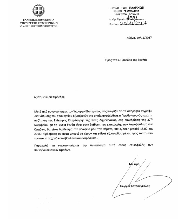Με επιστολή του προς τον Πρόεδρο της Βουλής, Νίκο Βούτση, ο αναπληρωτής υπουργός Εξωτερικών Γιώργος Κατρούγκαλος ανακοίνωσε ότι τα εν λόγω τηλεγραφήματα θα είναι προσβάσιμα στο γραφείο του μεταξύ 18:00 και 20:00. Θα μπορούν να τα δουν είτε οι ίδιοι οι επικεφαλής των Κοινοβουλευτικών Ομάδων δηλαδή οι πολιτικοί αρχηγοί, είτε οι ειδικά εξουσιοδοτημένοι κοινοβουλευτικοί εκπρόσωποι.