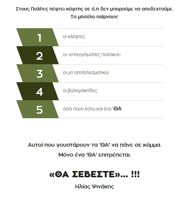 Και όμως, δεν ήταν πρωταπριλιάτικο αστείο, μιας και την Τετάρτη, βγήκε online το νέο site για το κόμμα, όπου καταγράφονται οι κύριες θέσεις του, διατυπωμένες στο γνώριμο στυλ του Ηλία Ψινάκη φυσικά.