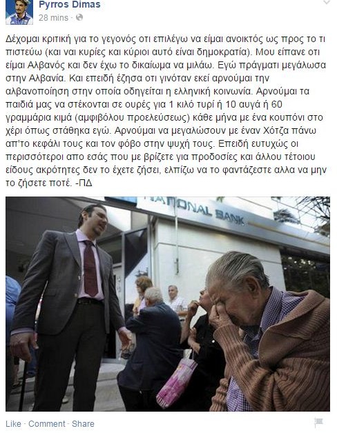 “Μου είπανε οτι είμαι Αλβανός και δεν έχω το δικαίωμα να μιλάω. Εγώ πράγματι μεγάλωσα στην Αλβανία. Και επειδή έζησα οτι γινόταν εκεί αρνούμαι την αλβανοποίηση στην οποία οδηγείται η ελληνική κοινωνία”, έγραψε στο Facebook ο ολυμπιονίκης και πρώην βουλευτής του ΠΑΣΟΚ Πύρρος Δήμας.