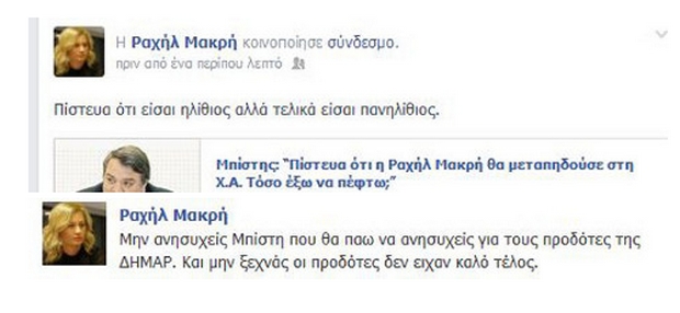 Η απάντηση της Ραχήλ Μακρή μέσω του ίδιου μέσου, του Facebook δηλαδή δεν άργησε να έρθει: «Πίστευα ότι είσαι ηλίθιος αλλά τελικά είσαι πανηλίθιος», ενώ λίγο αργότερα έγραψε το εξής: «Μην ανησυχείς Μπίστη που θα πάω να ανησυχείς για τους προδότες της ΔΗΜΑΡ. Και μην ξεχνάς οι προδότες δεν είχαν καλό τέλος».