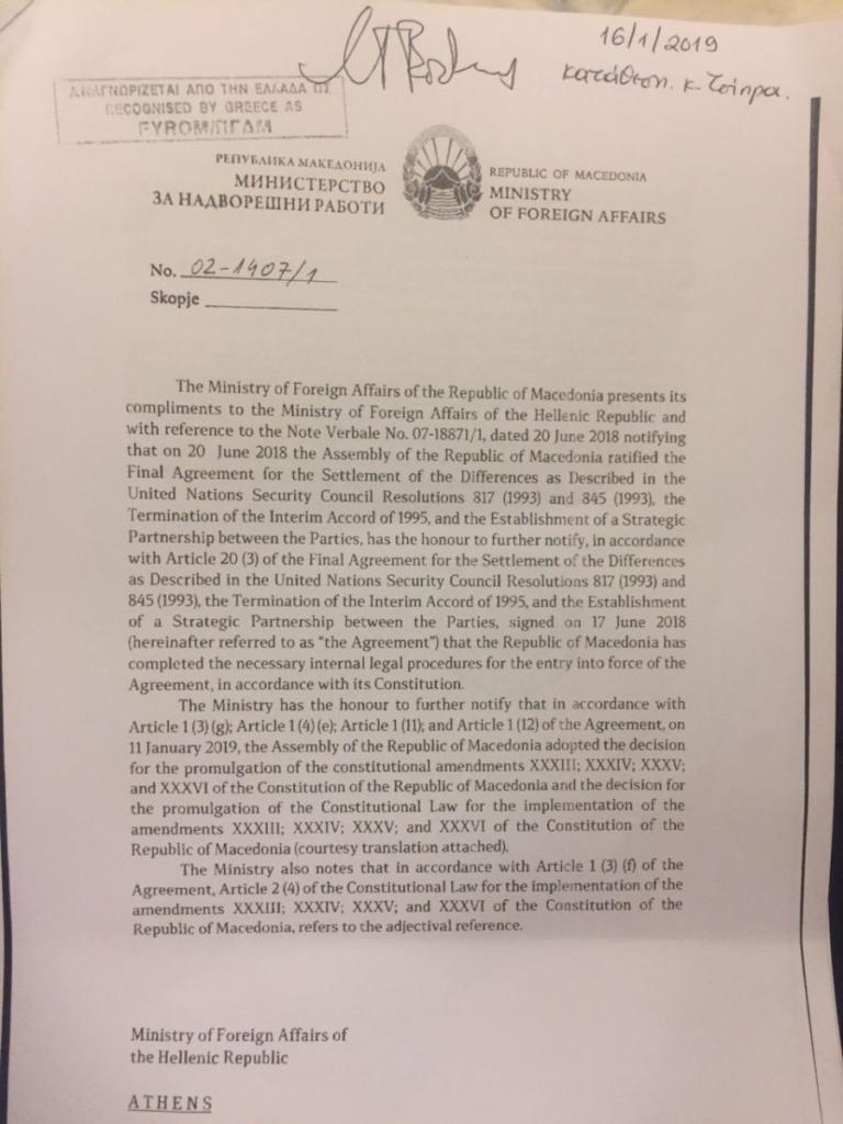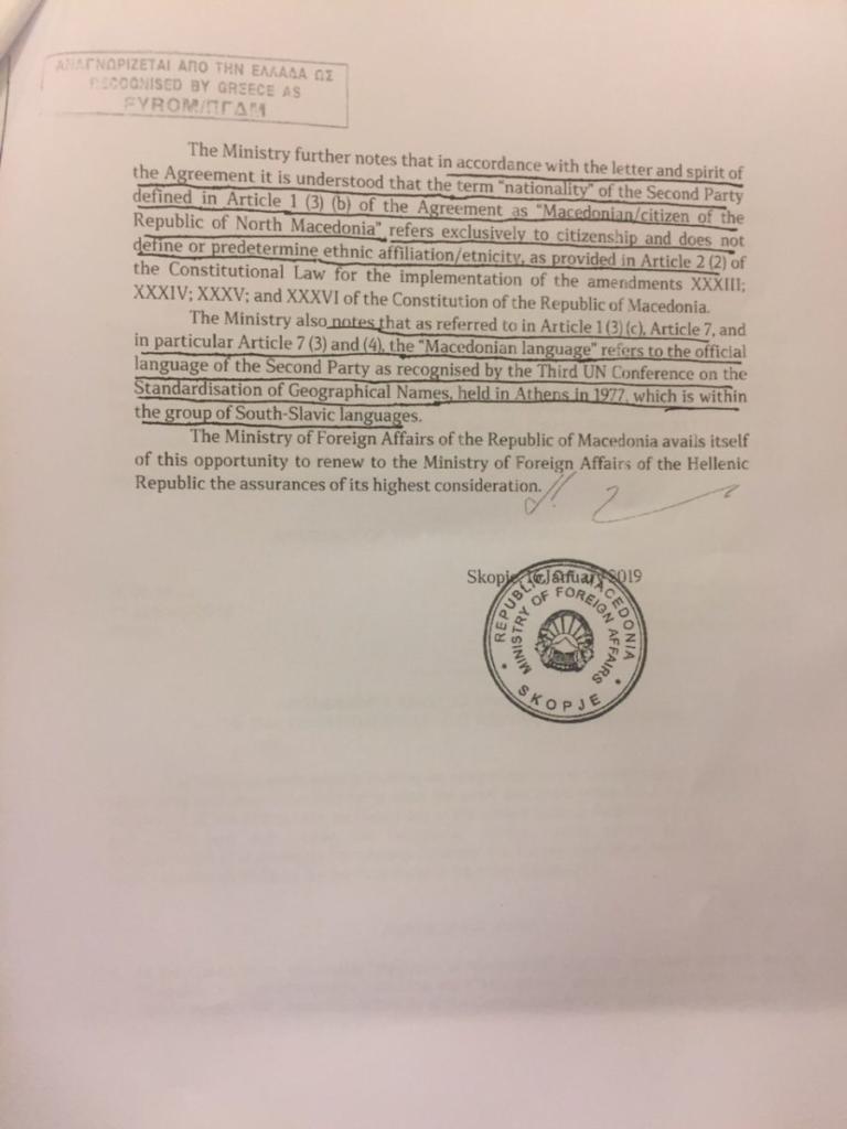 Τα τέσσερα θέματα που διευκρινίζει η ρηματική διακοίνωση και η οποία εστάλη από την πΓΔΜ στο ΥΠΕΞ.