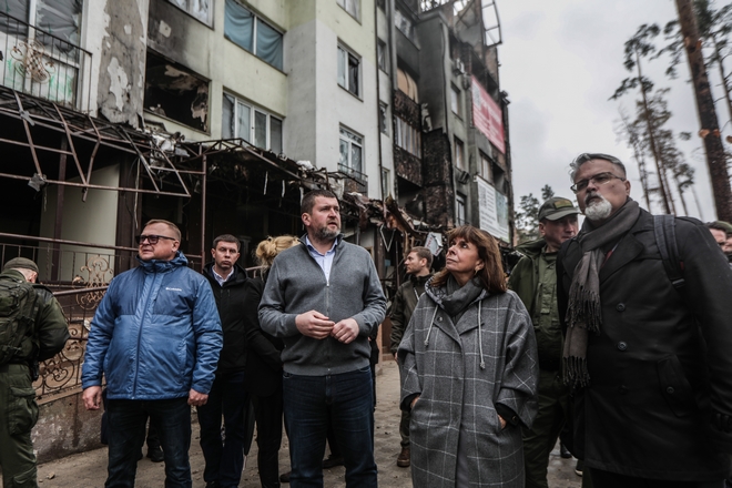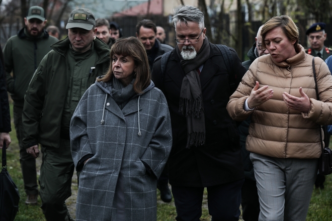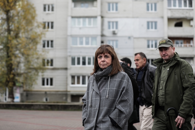 Συνοδευόμενη από τον υπουργό Εθνικής Άμυνας η Πρόεδρος της Δημοκρατίας επισκέφθηκε τις πληγείσες από τους βομβαρδισμούς πόλεις Μποροντιάνκα, Μπούτσα και Ιρπίν στην Ουκρανία.