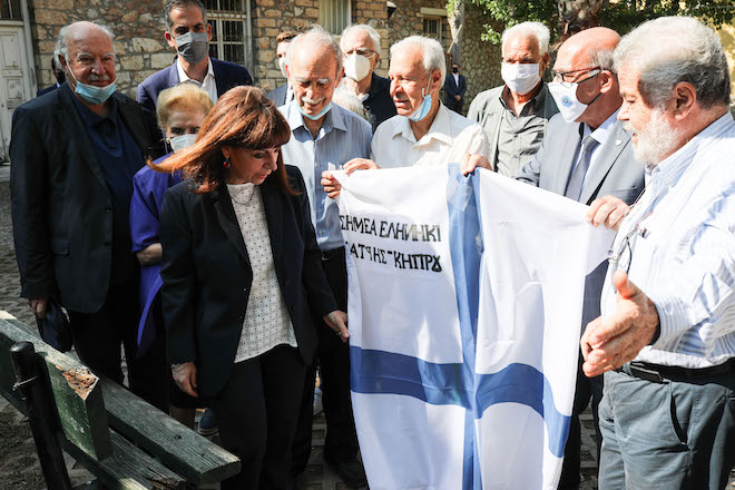 Την κυρία Σακελλαροπούλου υποδέχθηκαν ο Δήμαρχος Αθηναίων Κώστας Μπακογιάννης και ο Πρόεδρος του Συνδέσμου Φυλακισθέντων και Εξορισθέντων Αντιστασιακών 1967-1974 Ευάγγελος Γκιουγκής.