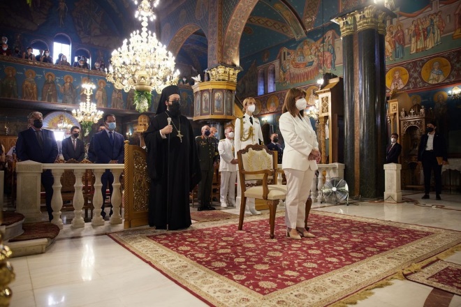 Με μηνύματα για τη σημερινή γιορτή αλλά, ταυτόχρονα, και για την τραγωδία απόρροια των πυρκαγιών, συνόδευσε την παρουσία της στη Θεία Λειτουργία στον Ιερό Καθεδρικό Ναό της Κοιμήσεως της Θεοτόκου Νέας Φιλαδέλφειας, η Πρόεδρος της Δημοκρατίας Κατερίνα Σακελλαροπούλου.